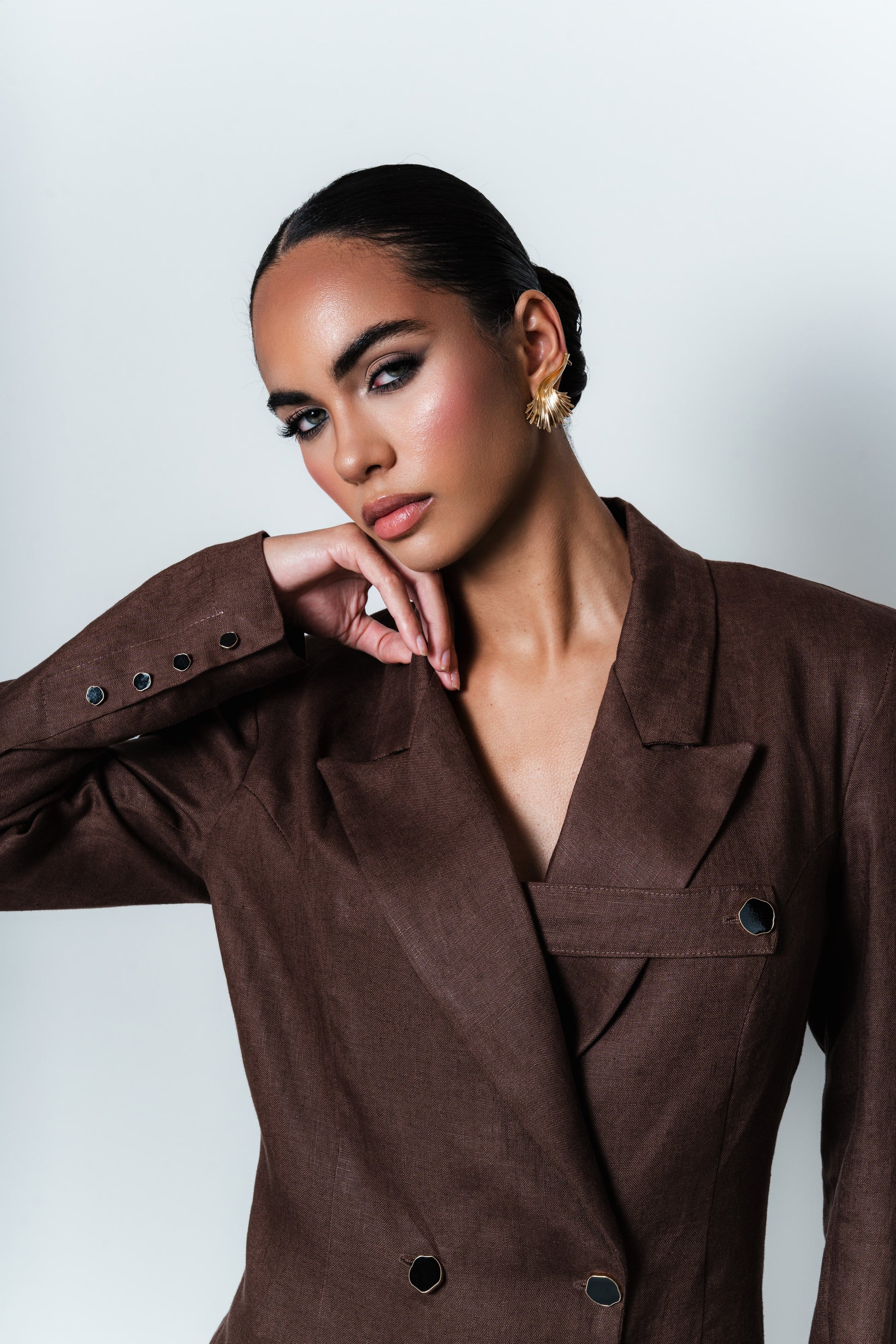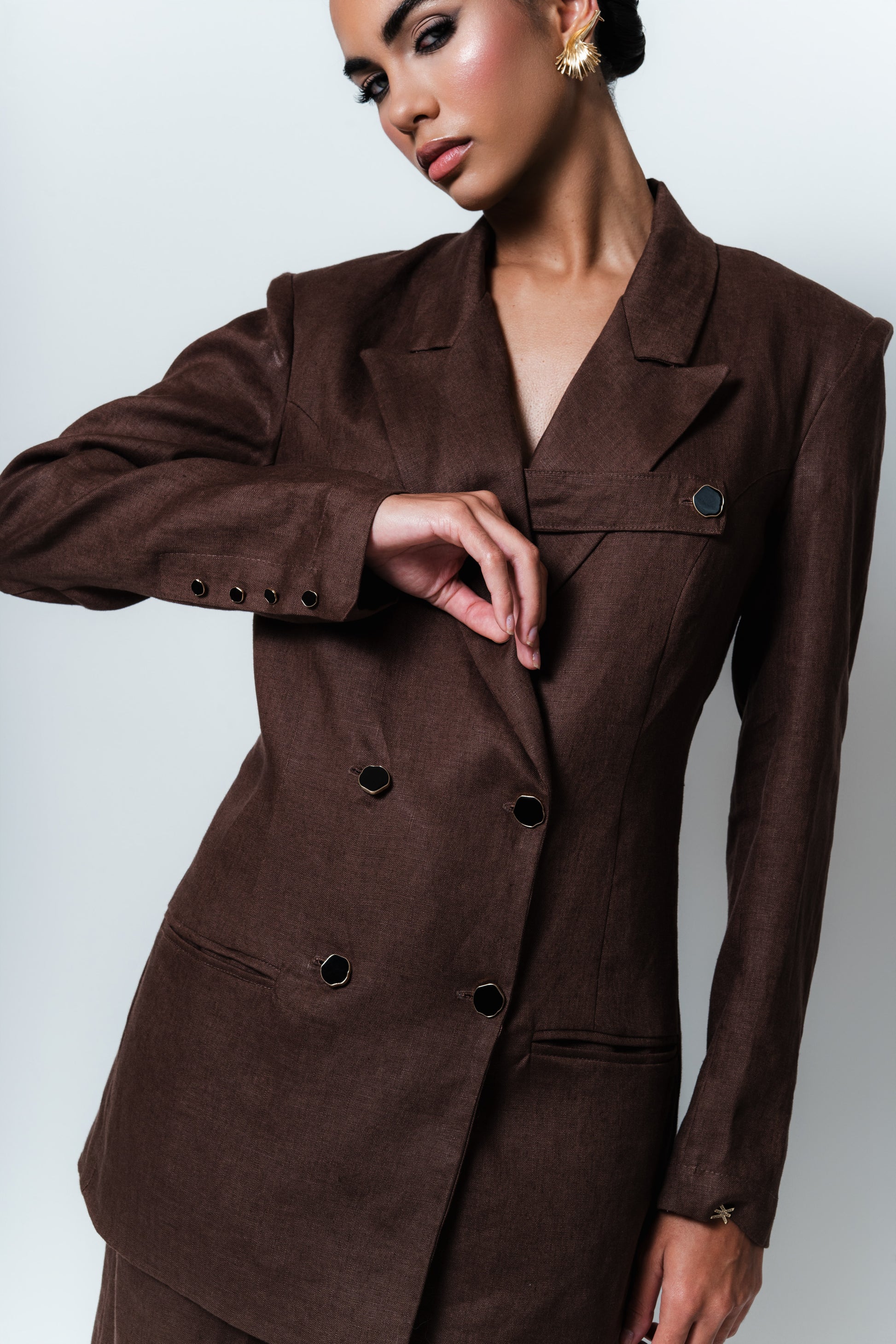Blazer confeccionado em linho puro, com forro interno em acetato, garantindo conforto e caimento impecável. Seu design contemporâneo une a estrutura clássica do paletó com toques modernos, resultando em uma peça versátil e refinada. Com recortes estratégicos que valorizam a silhueta e botões contrastantes elegantes, ideal para transitar do look de trabalho à produção noturna com facilidade. A modelagem acinturada, o acabamento impecável e a leveza do linho tornam essa peça um verdadeiro curinga no closet.