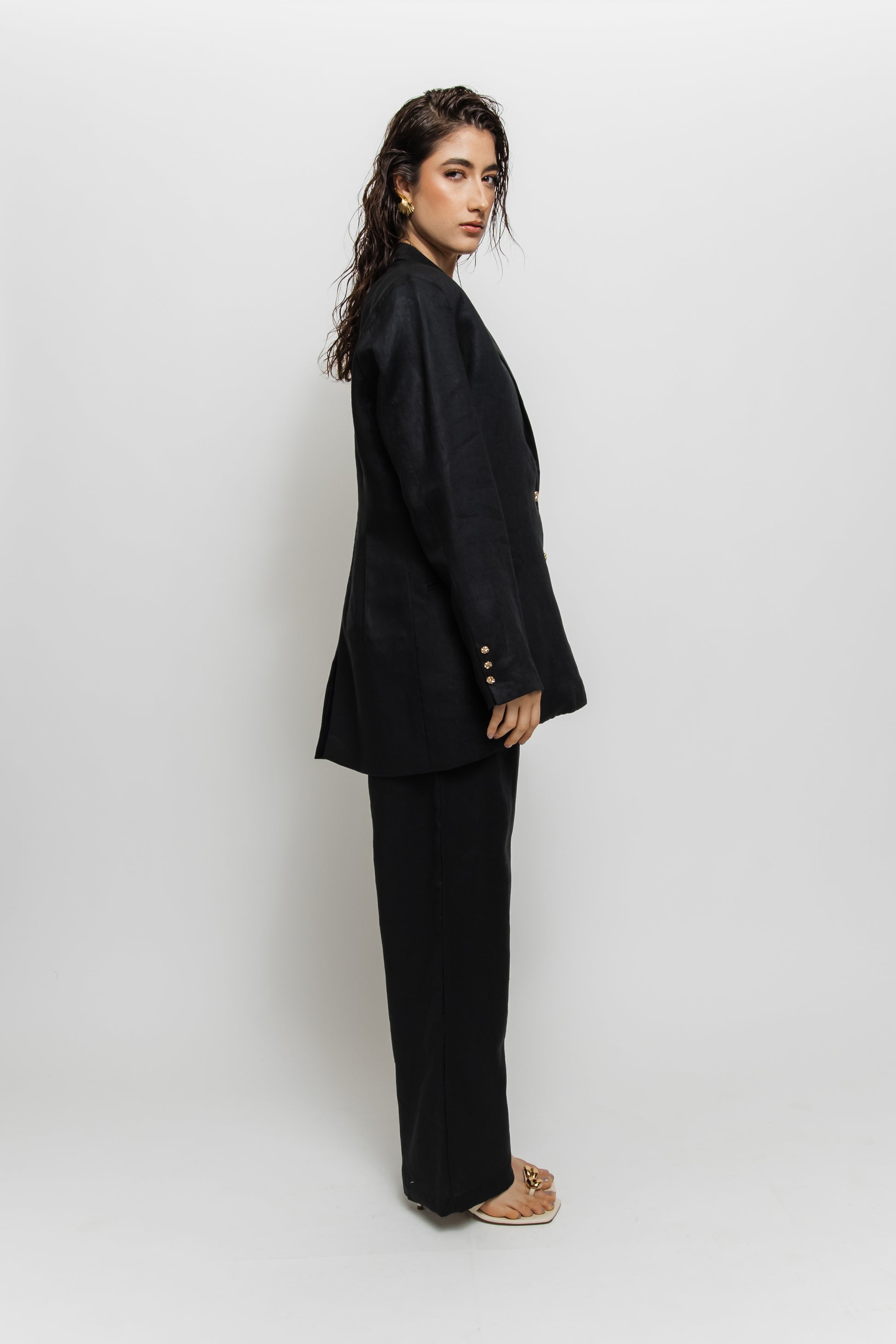 A alfaiataria clássica realça o perfil escultural do blazer feito em linho puro, shape acinturado por pregas nas costas, comprimento alongado com design clássico, ombreira, os bolsos com lapela e nas laterais, pode ser usado sozinho como vestido, ou de maneira tradicional sob calça, short ou saia. Elegante e atemporal, tem nas cores natural, branco e preto.
