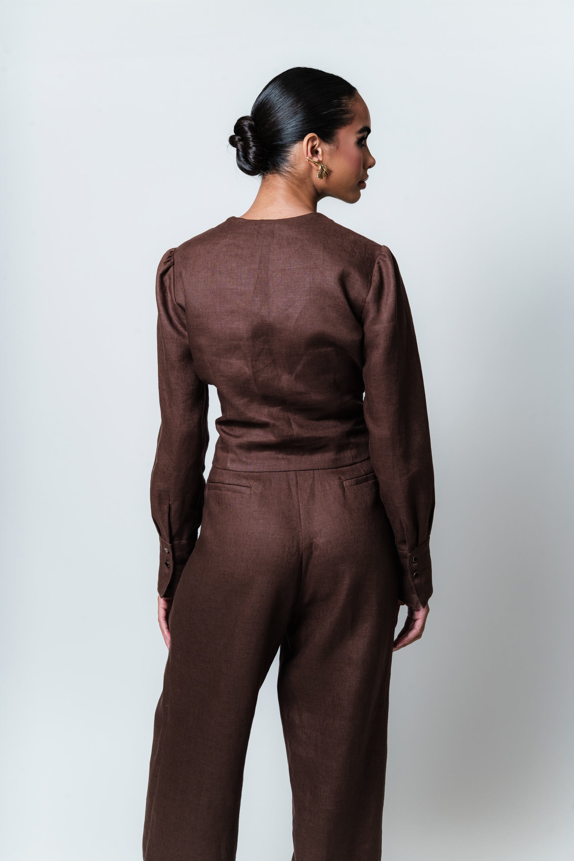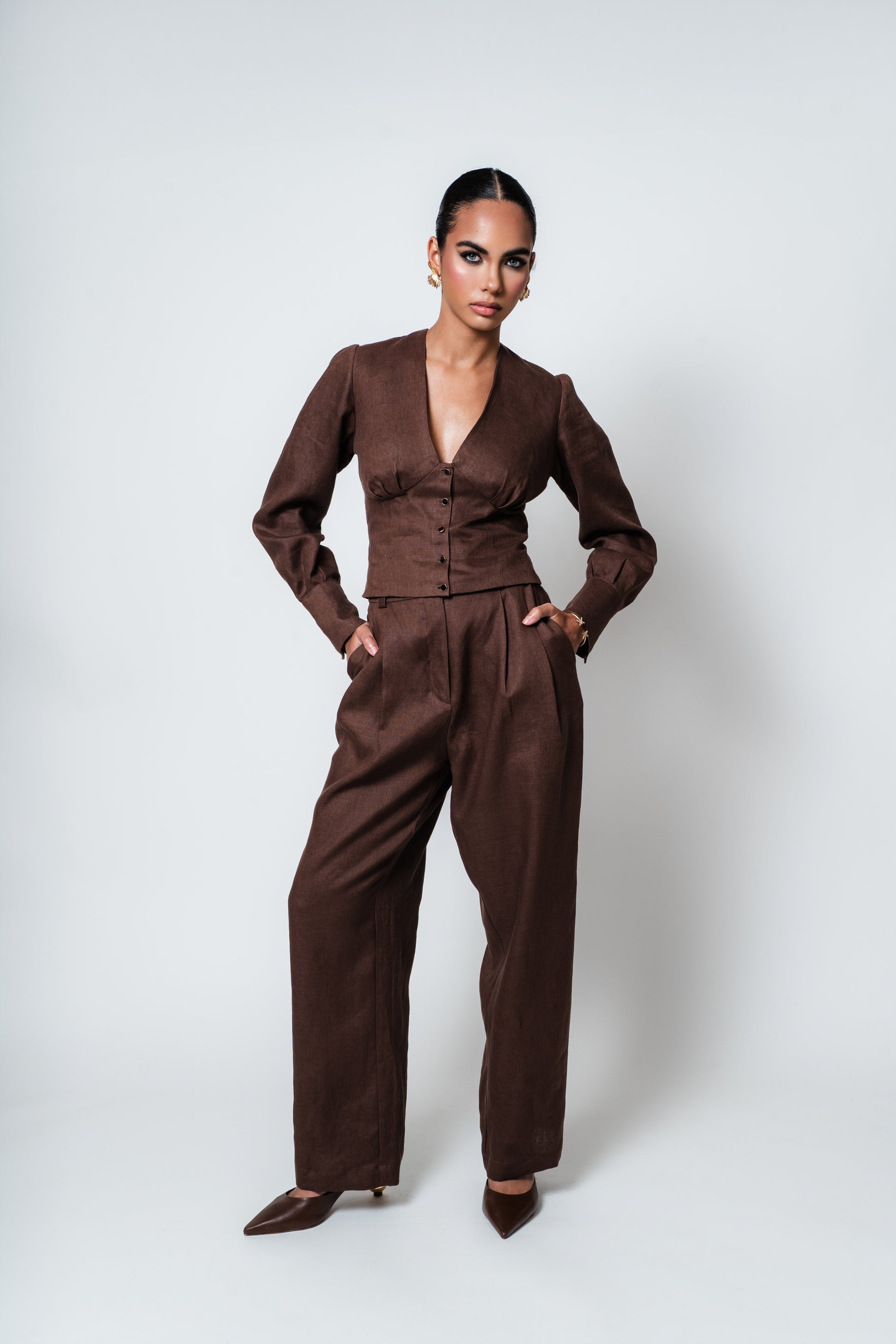 Blusa com design de corset apresenta decote profundo, busto levemente franzido, recorte na cintura com botões esmaltados. Confeccionada em linho puro, oferece estrutura e conforto com um design contemporâneo, adicionando elegância e versatilidade a qualquer guarda-roupa. COMPOSIÇÃO: 100% linho.