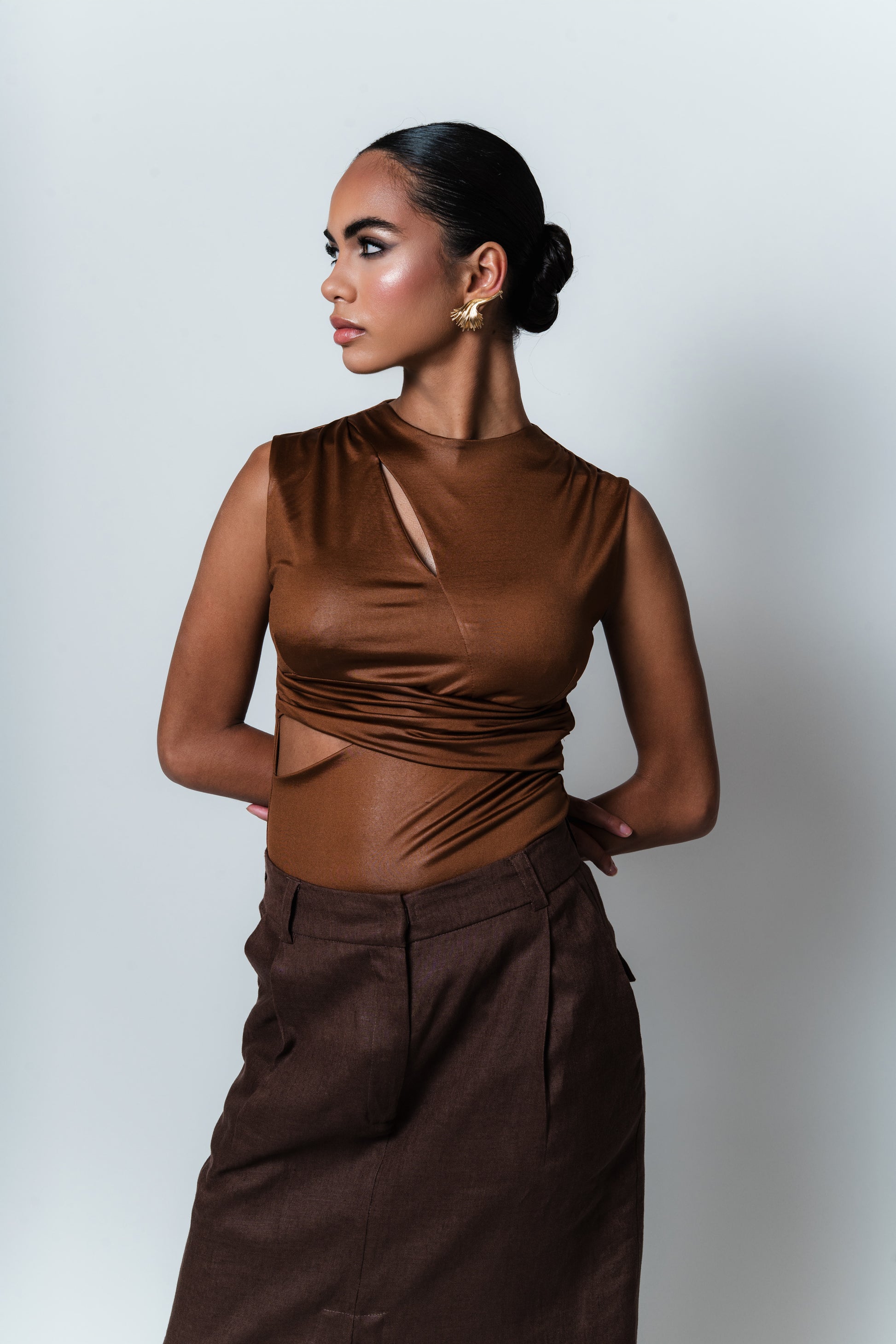 Blusa com recortes feita em malha, os recortes estratégicos cut it out revelam parte do colo e da cintura de maneira chique e discreta. Design contemporâneo, com fendas, transpasses e uma tomba franzida abaixo do busto, tornam a regata extremamente exclusiva e sofisticada.