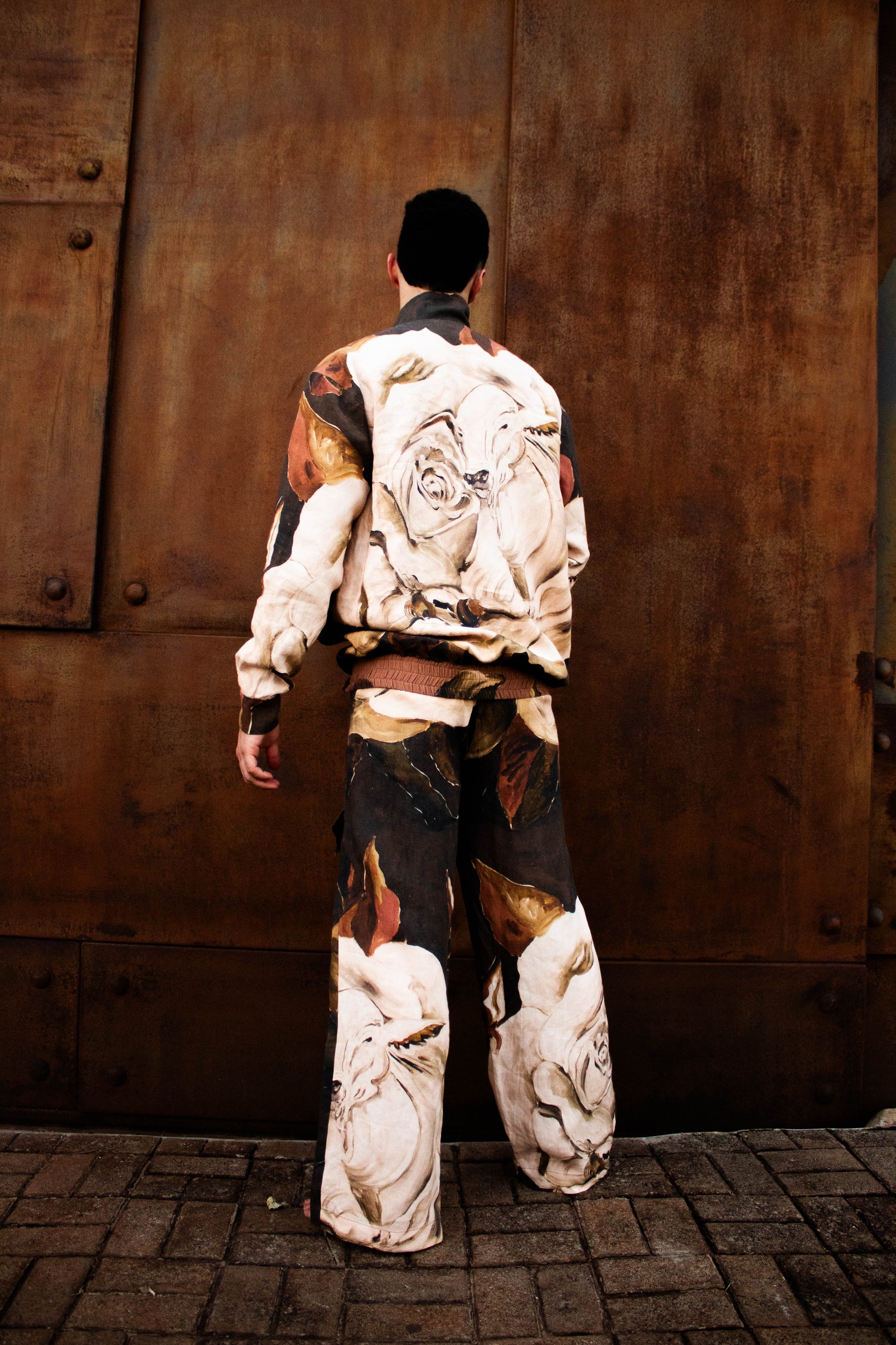 Para o Inverno 25, exaltamos nosso DNA artsy e sofisticado da marca através das estampas exclusivas, modelagens contemporâneas e peças-chave para o closet chique e atemporal. A estampa exclusiva "Rosa-Boi", ilustra a obra de mesmo nome do renomado artista Humberto Espindola, conhecido por retratar a bovinocultural do Mato Grosso do Sul, a série de pinturas Rosa-Boi homenageia a força do boi nelore, com a delicadeza das rosas, ambos originários de mutação genética, criam um contraste visual impressionante.