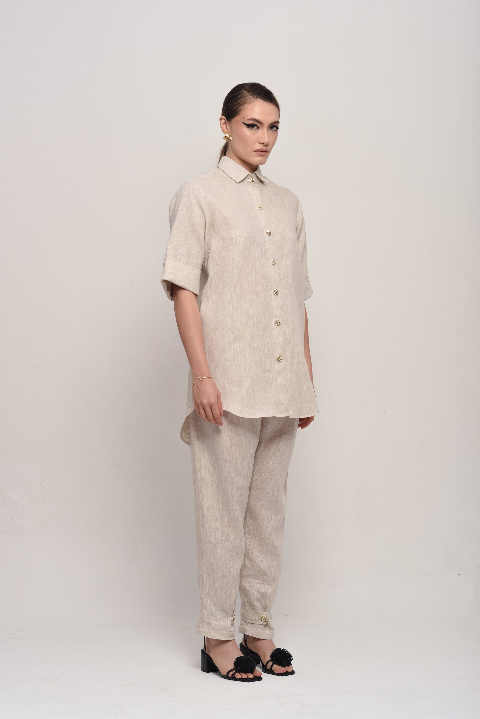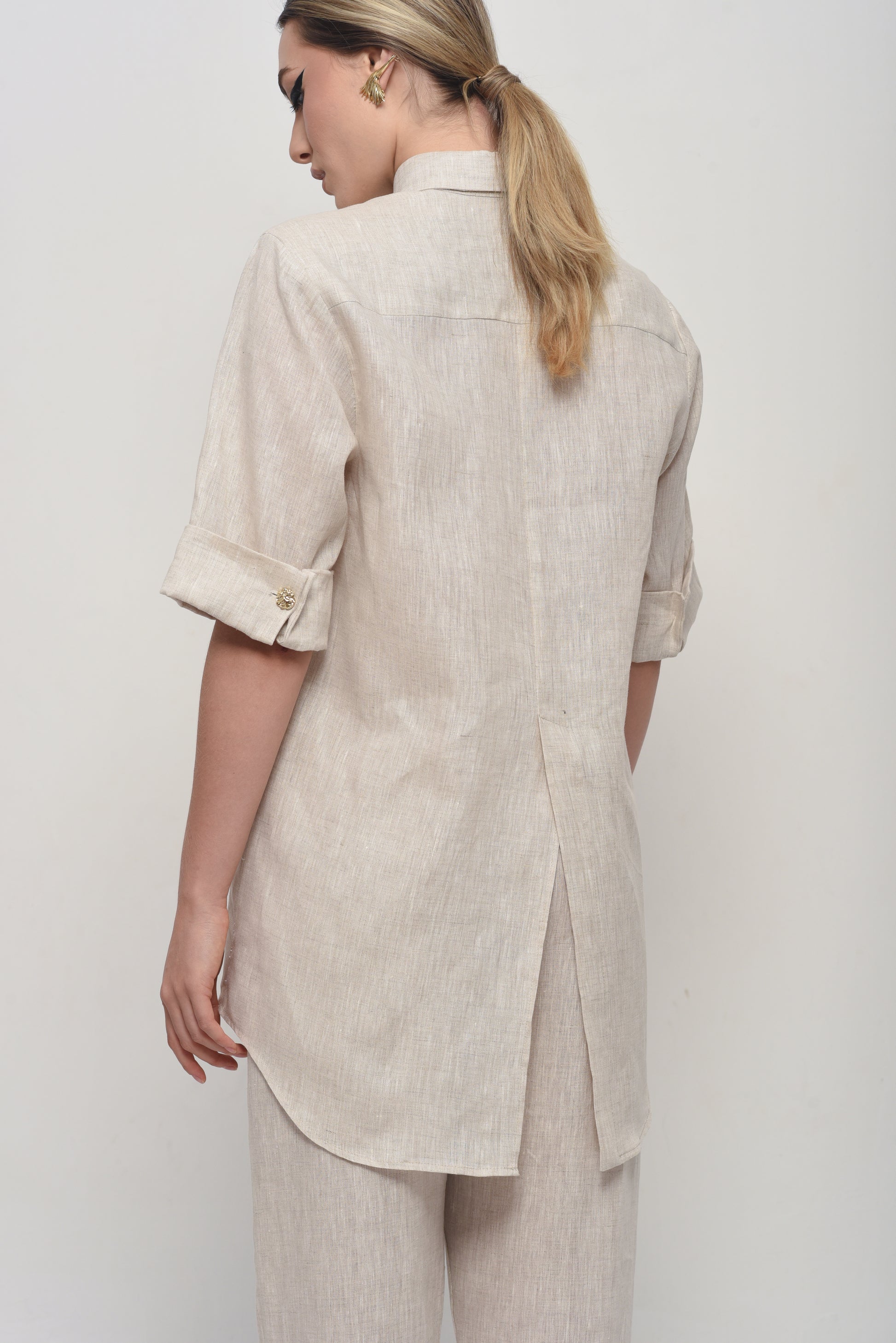 Must have das coleções Kakô, a camisa Alfaiataria é uma peça prática, chique e versátil. Camisa manga curta com shape fraldado e fenda nas costas, feita em linho puro com botões dourados.