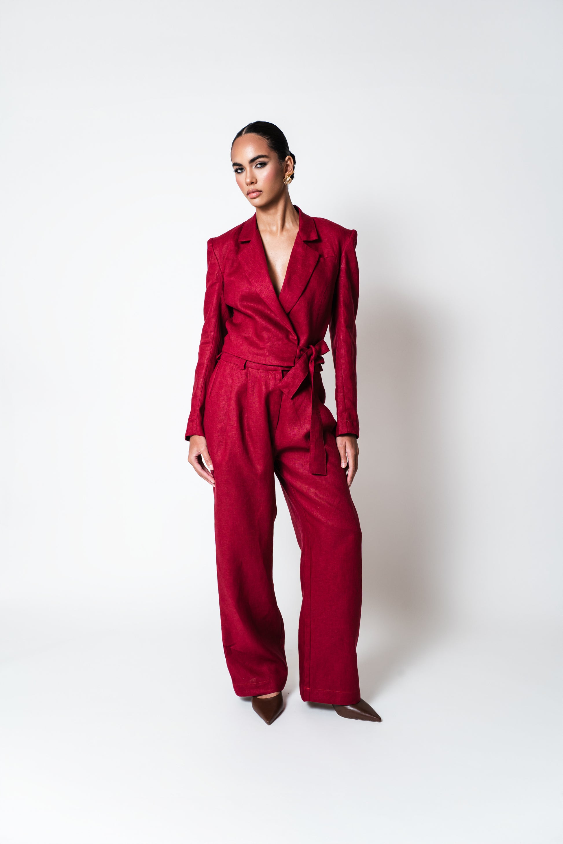 Cropped Blazer feito em linho puro mistura elegância e ousadia, design contemporâneo e acabamento premium. Com gola de fraque e amarração na cintura, ele proporciona um ajuste perfeito e valoriza a silhueta de forma sofisticada. A parte das costas vazada adiciona um toque de modernidade e sensualidade, criando um visual único e descomplicado.