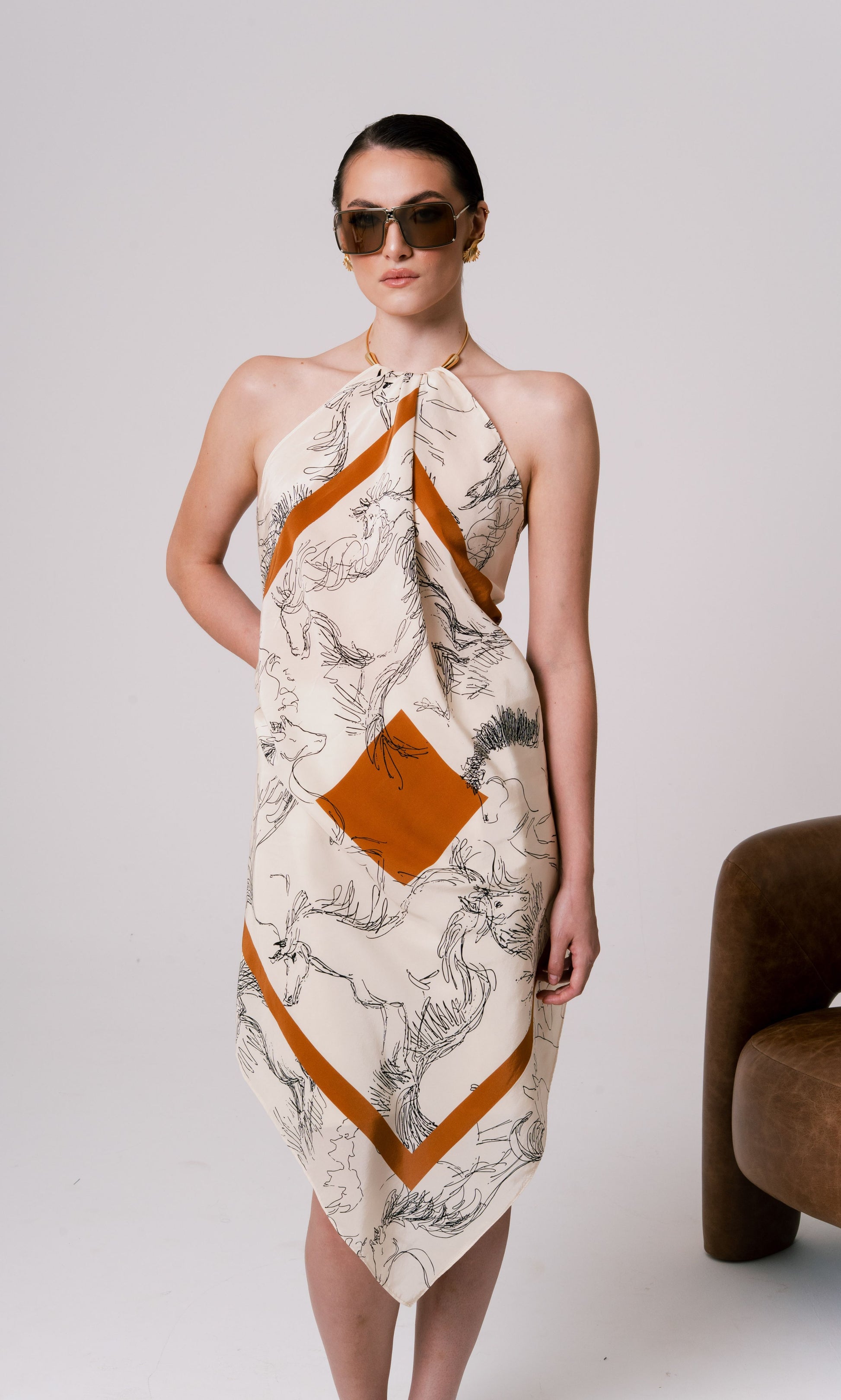Elegante, artístico e versátil, para homens e mulheres, o lenço de seda pura pode ser usada no pescoço com diversas possibilidades de amarrações, no cabelo, no cós da calça ou como decoração de bolsa, adornando looks de verão ou inverno. Esta versão é ilustrada com a estampa da obra Cavalos Tropeiros na versão fundo preto e caramelo, assinado pela artista sul-matogrossense Zilá Soares.