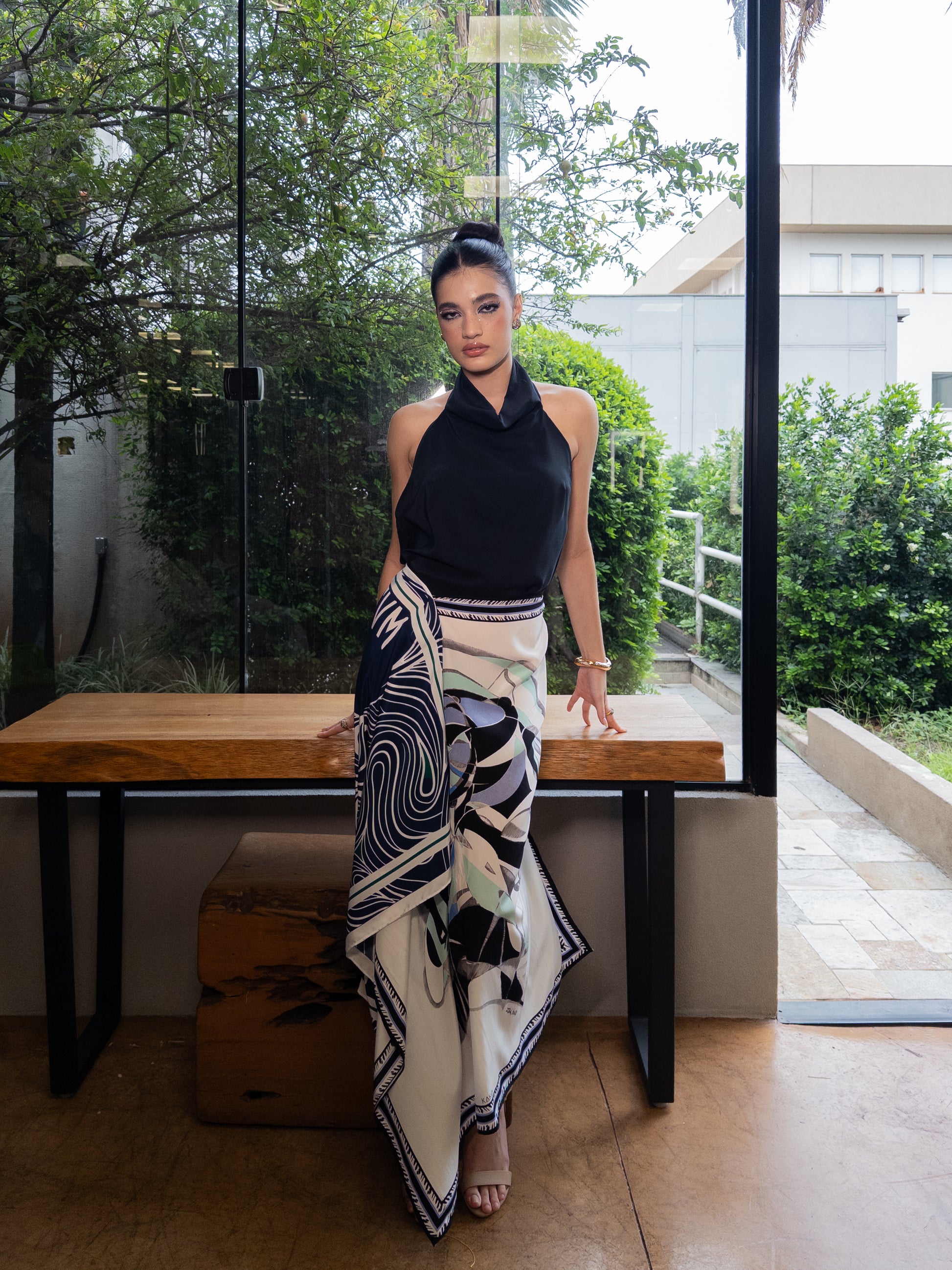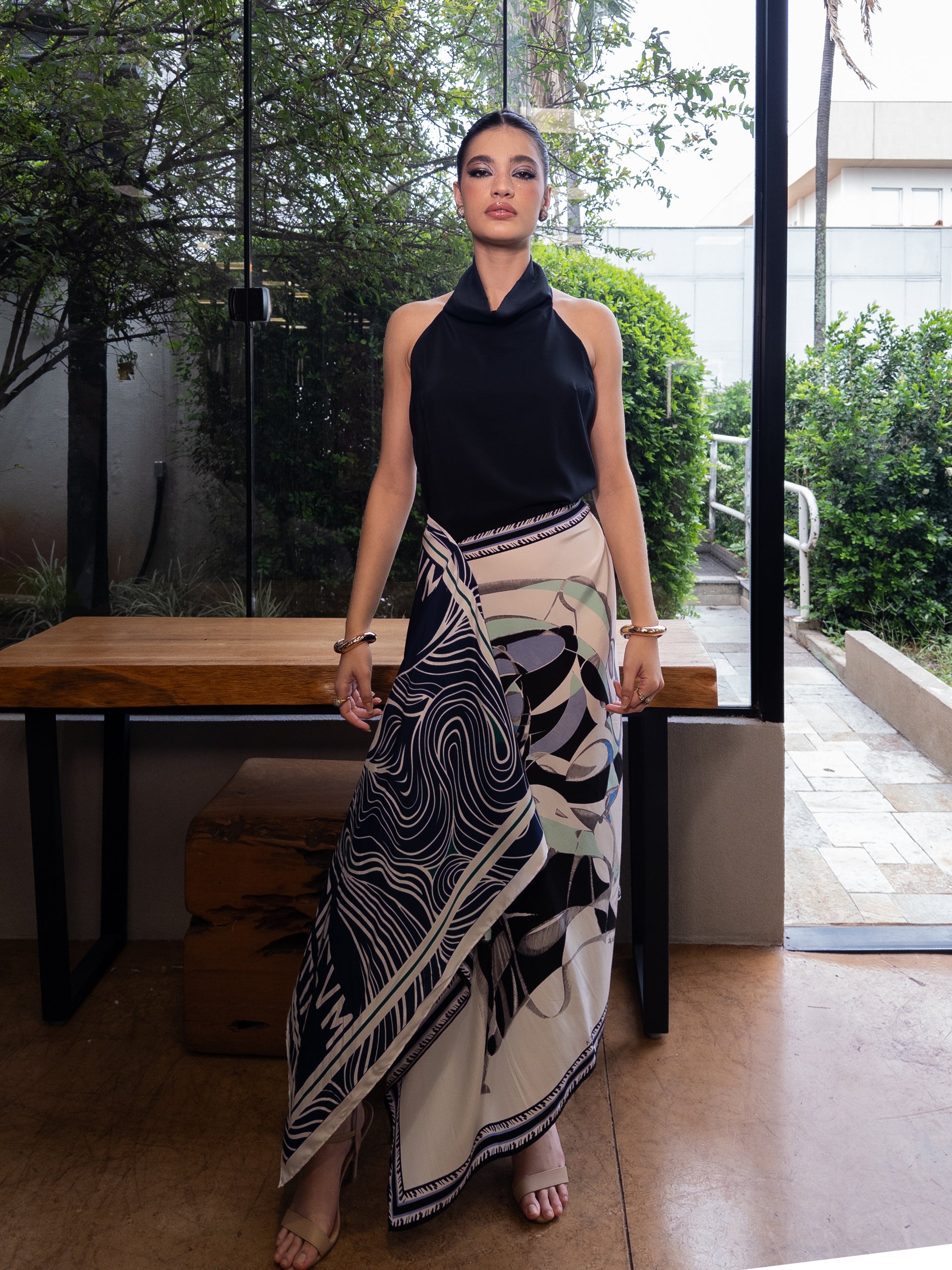 Lenço feito em seda pura com estampa exclusiva da obra Circuntatia pintada pelo artista Humberto Espíndola, pincelada de linhas psicodélicas e escrita com letra gráfica, remete às linhas orgânicas visão aérea das vazantes do Pantanal na época da cheia, produzida nos anos 70 pelo grande mestre da bovinocultura brasileira, do qual tivemos a honra de ilustrar.
