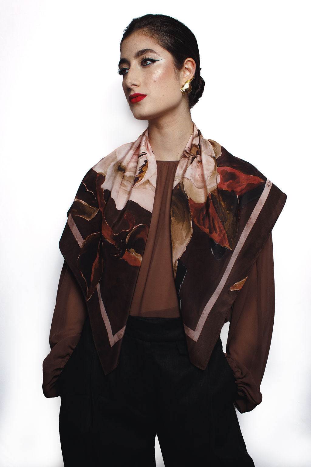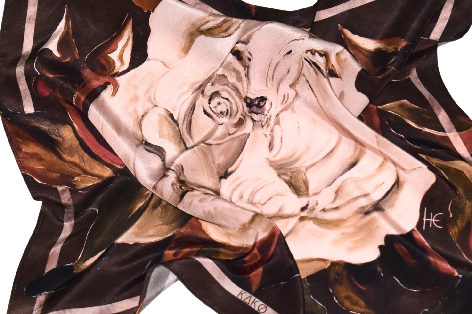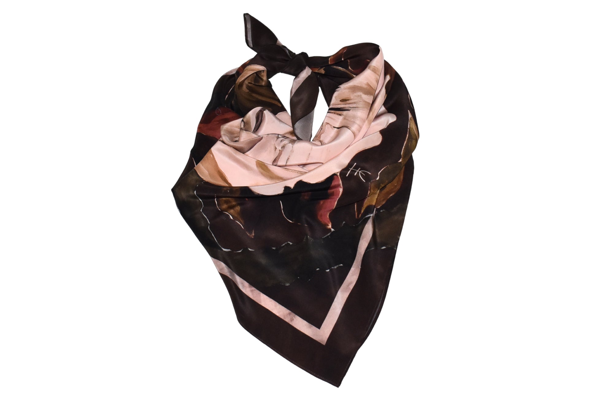 Lenços carré 90x90 feito em seda pura com estampa exclusiva da obra Rosa-boi pintada pelo artista sul-matogrossense Humberto Espíndola, considerado o mestre da arte da bovino cultura. O formato carré - quadrado possibilita diversos estilos de amarrações, seja na cintura, sob os ombros ou enrolado no pescoço, adornando peças básicas como camisetas, camisas, blazers e vestidos.