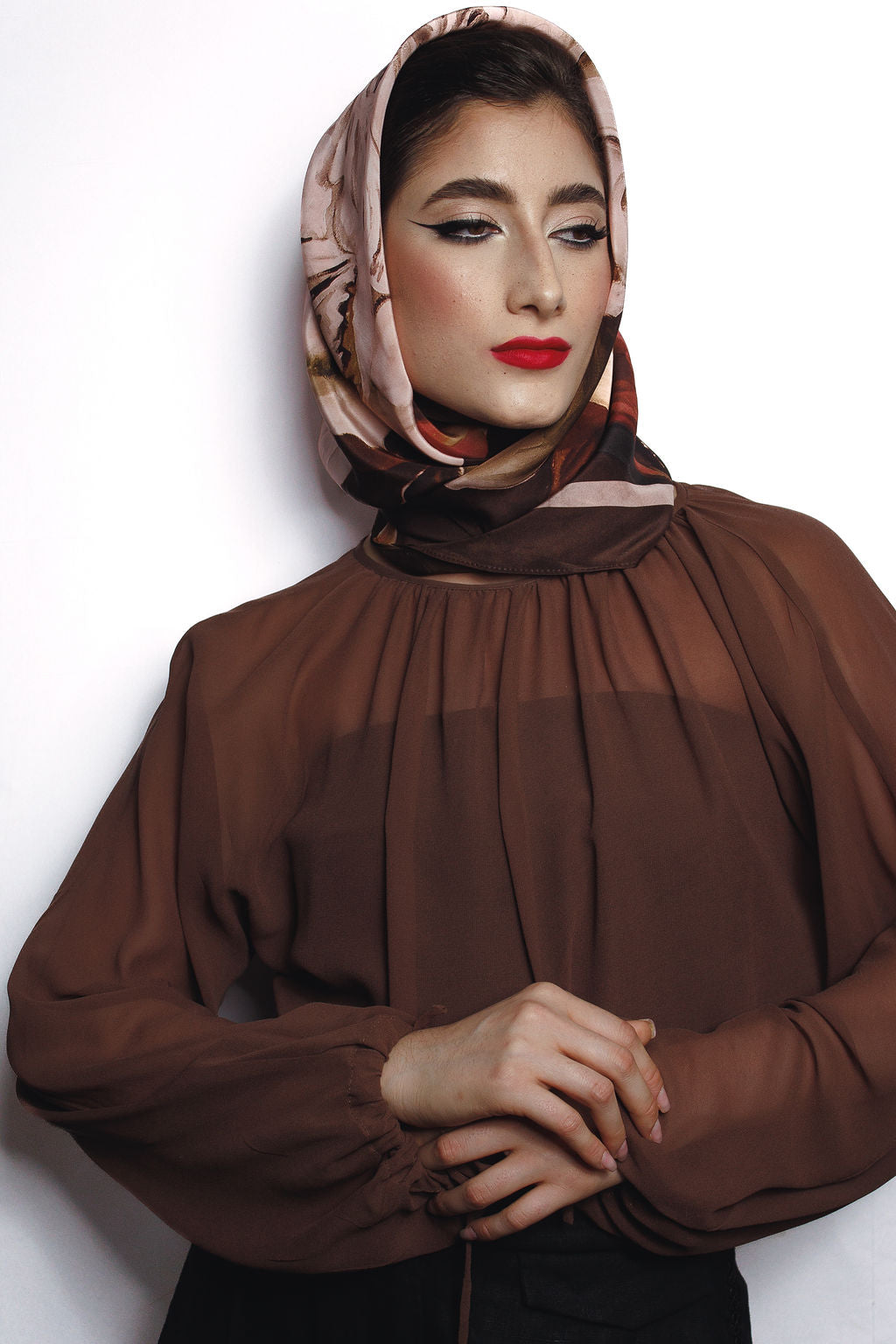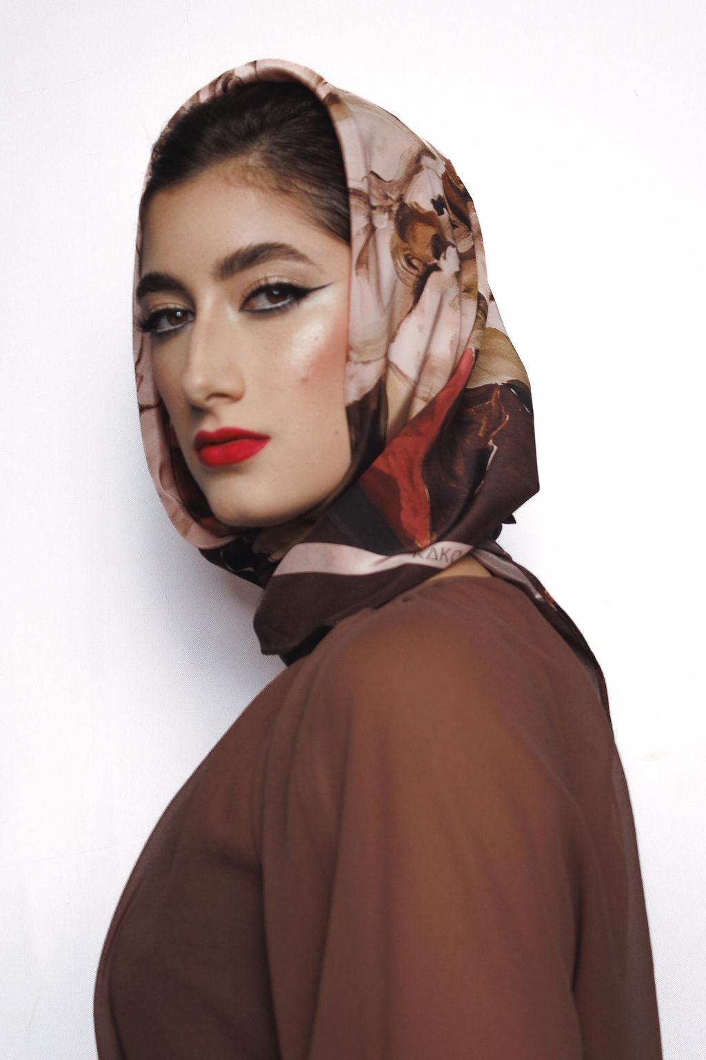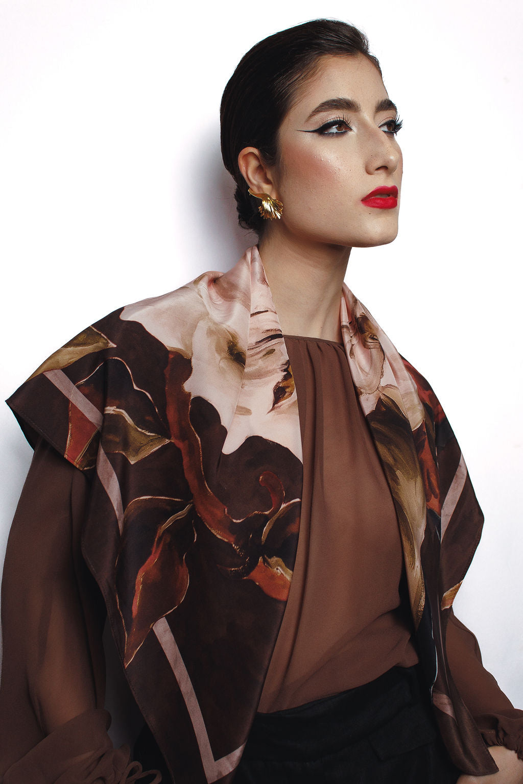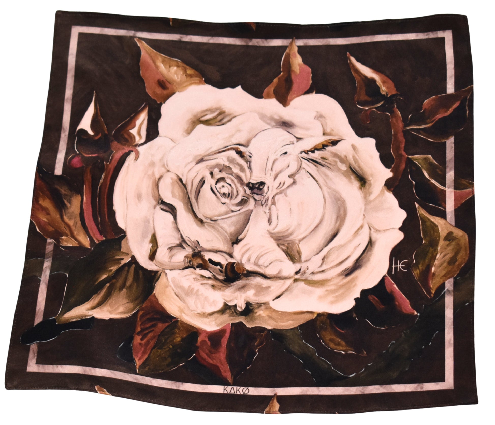Lenços carré 90x90 feito em seda pura com estampa exclusiva da obra Rosa-boi pintada pelo artista sul-matogrossense Humberto Espíndola, considerado o mestre da arte da bovino cultura. O formato carré - quadrado possibilita diversos estilos de amarrações, seja na cintura, sob os ombros ou enrolado no pescoço, adornando peças básicas como camisetas, camisas, blazers e vestidos.