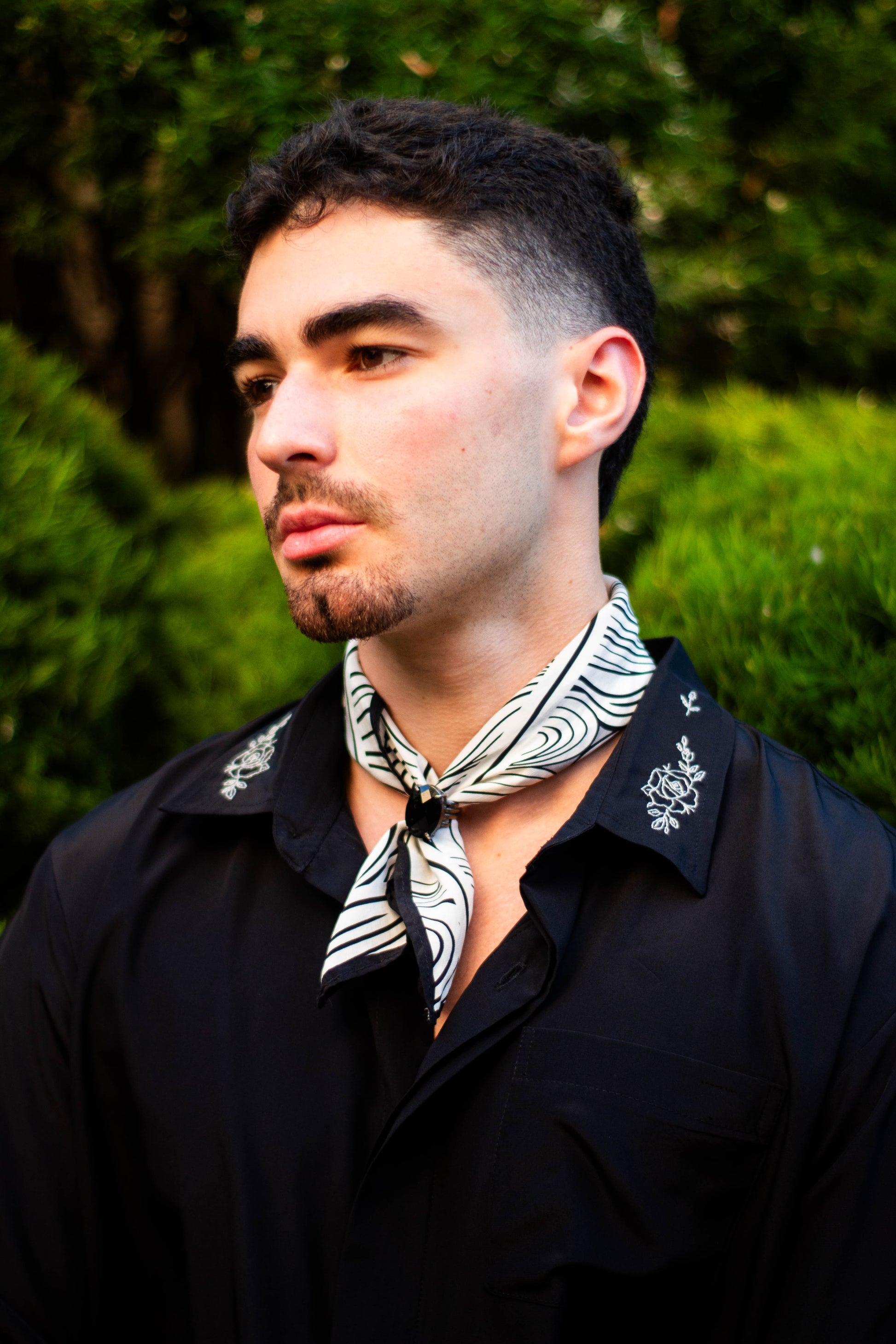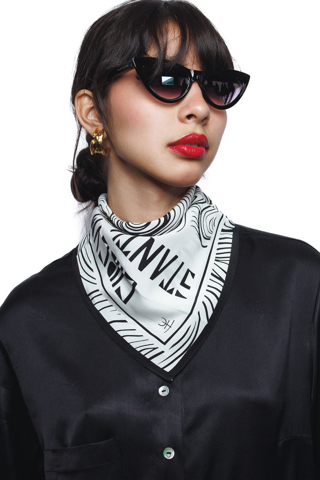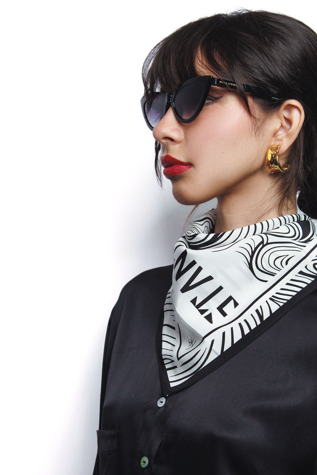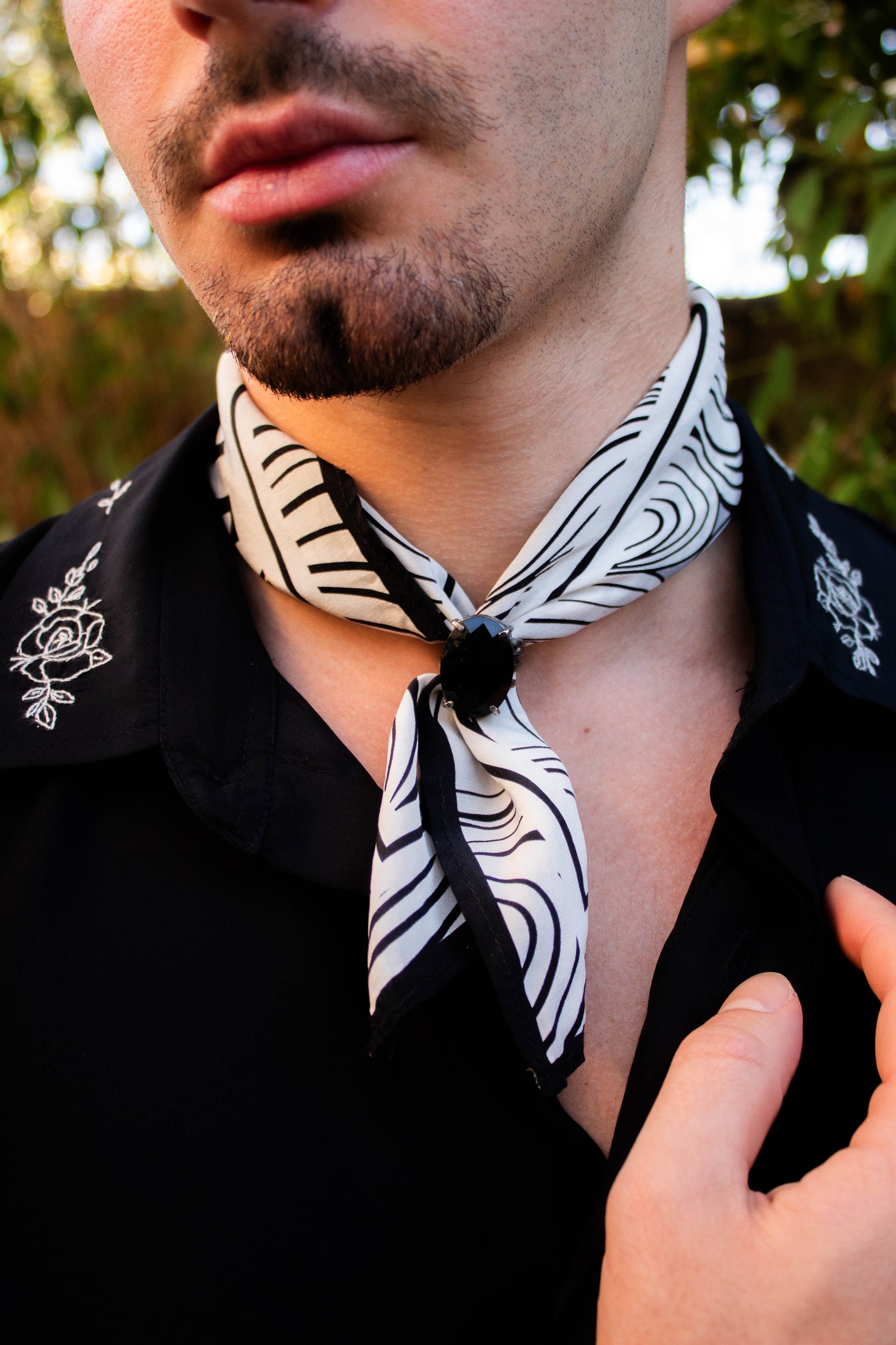 Elegante, artístico e versátil, para homens e mulheres, o lenço de seda pura pode ser usada no pescoço com diversas possibilidades de amarrações, no cabelo, no cós da calça ou como decoração de bolsa, adornando looks de verão ou inverno. Esta versão é ilustrada com a estampa da obra Circunstantia, na versão preta e branca, assinada pelo artista sul-matogrossense Humberto Espíndola.