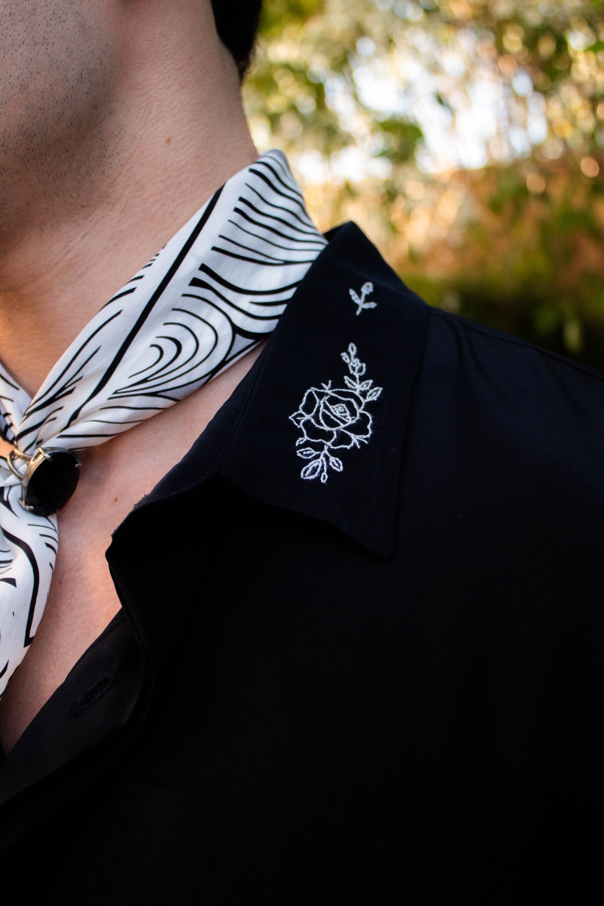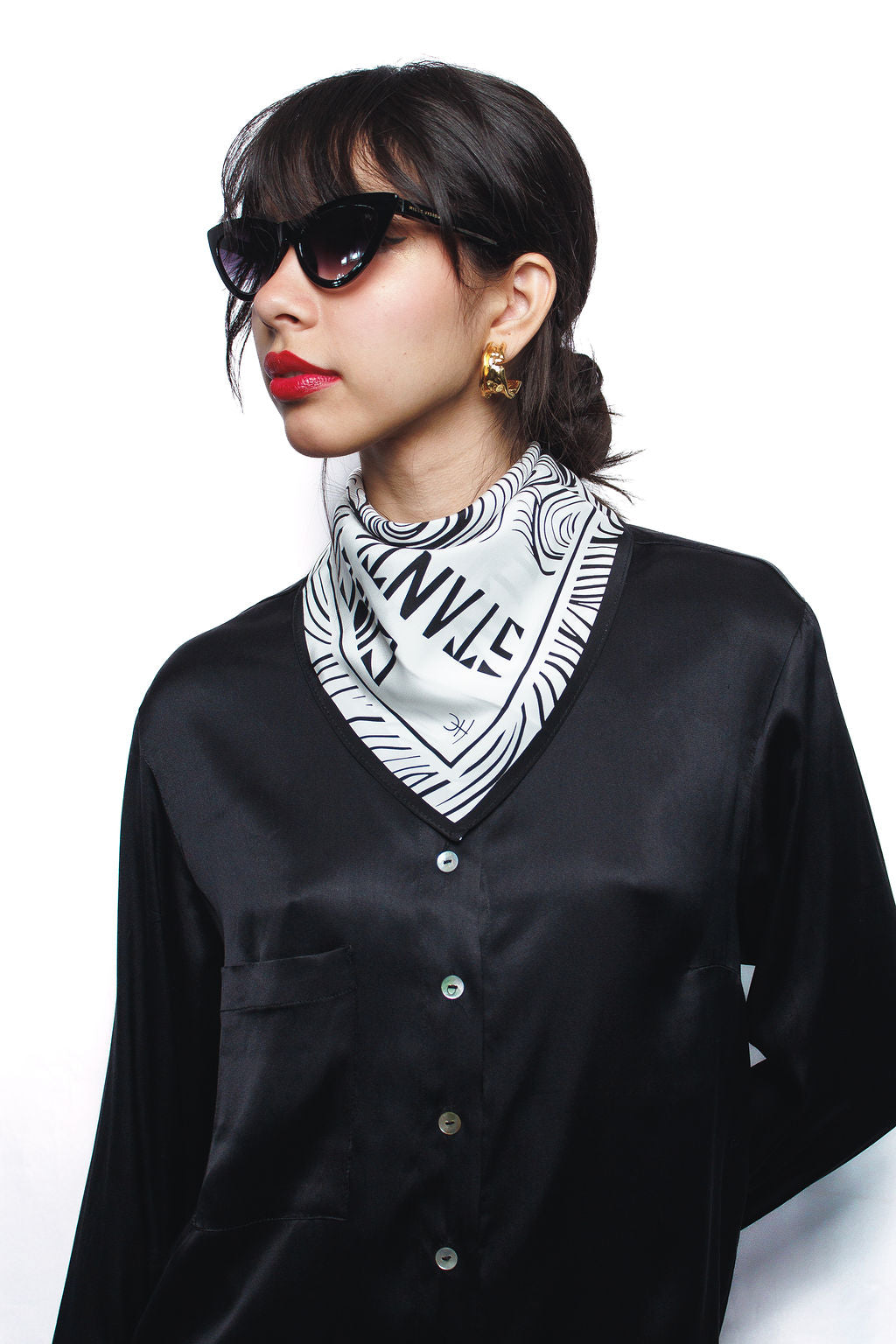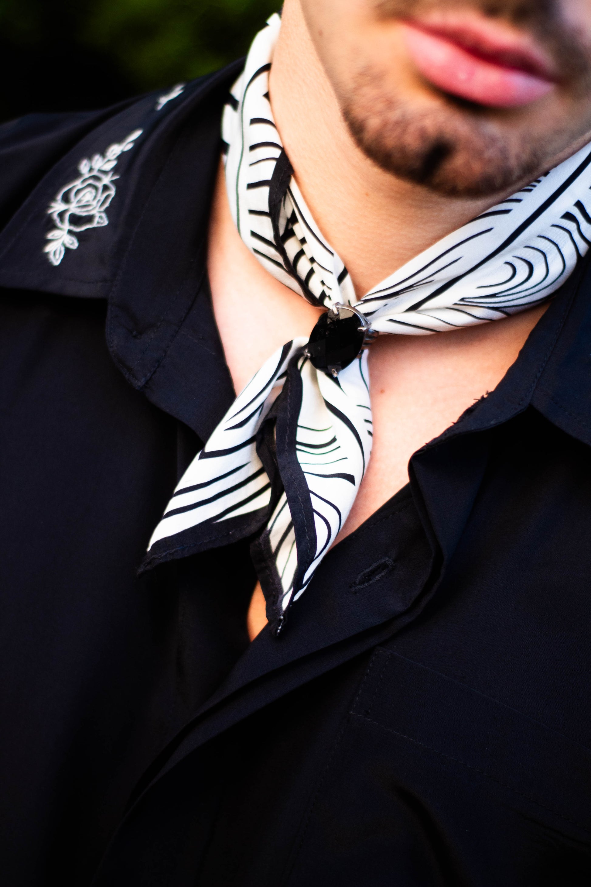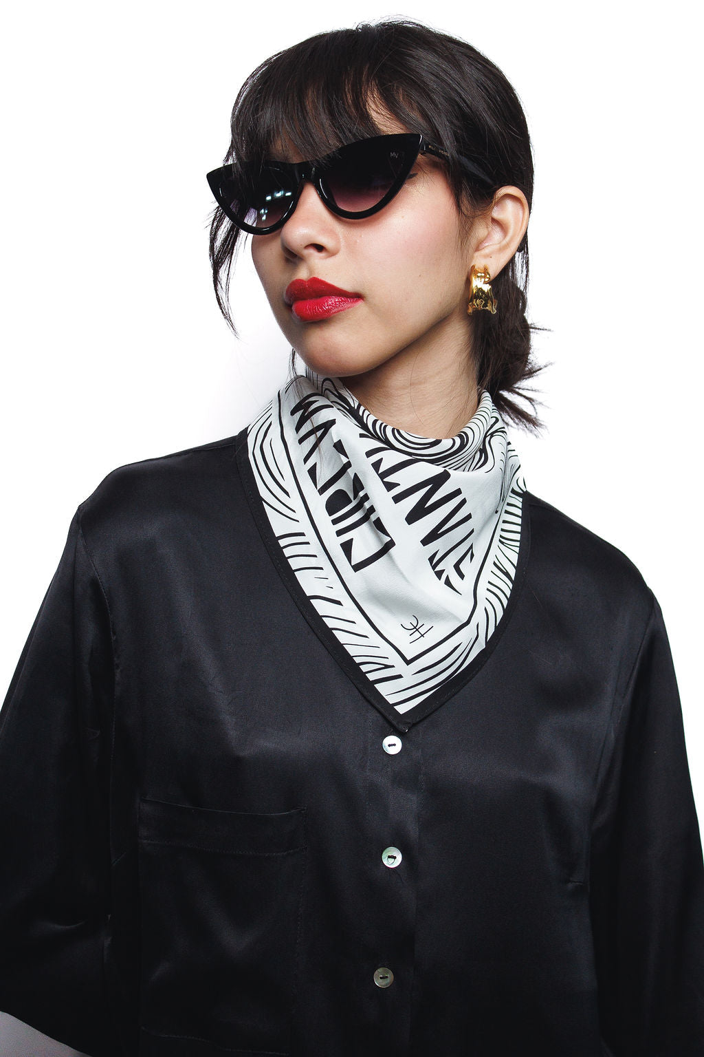 Elegante, artístico e versátil, para homens e mulheres, o lenço de seda pura pode ser usada no pescoço com diversas possibilidades de amarrações, no cabelo, no cós da calça ou como decoração de bolsa, adornando looks de verão ou inverno. Esta versão é ilustrada com a estampa da obra Circunstantia, na versão preta e branca, assinada pelo artista sul-matogrossense Humberto Espíndola.