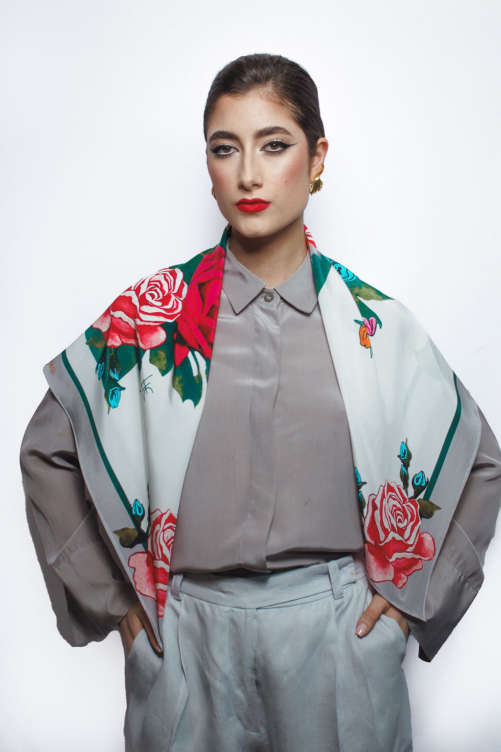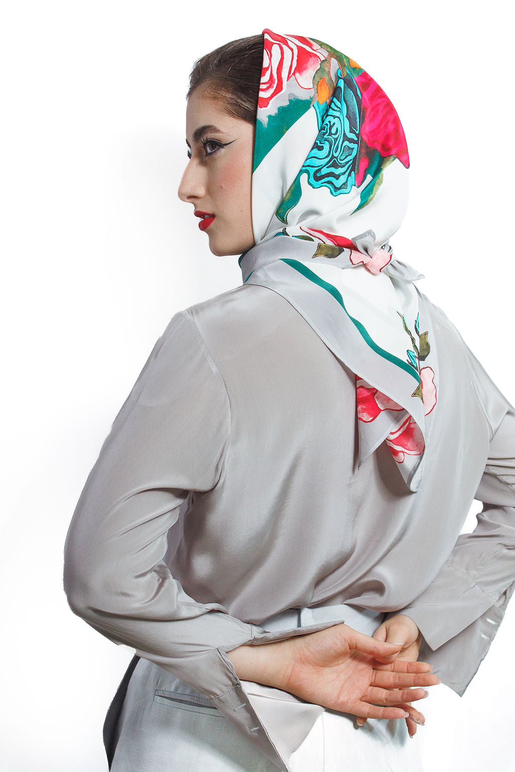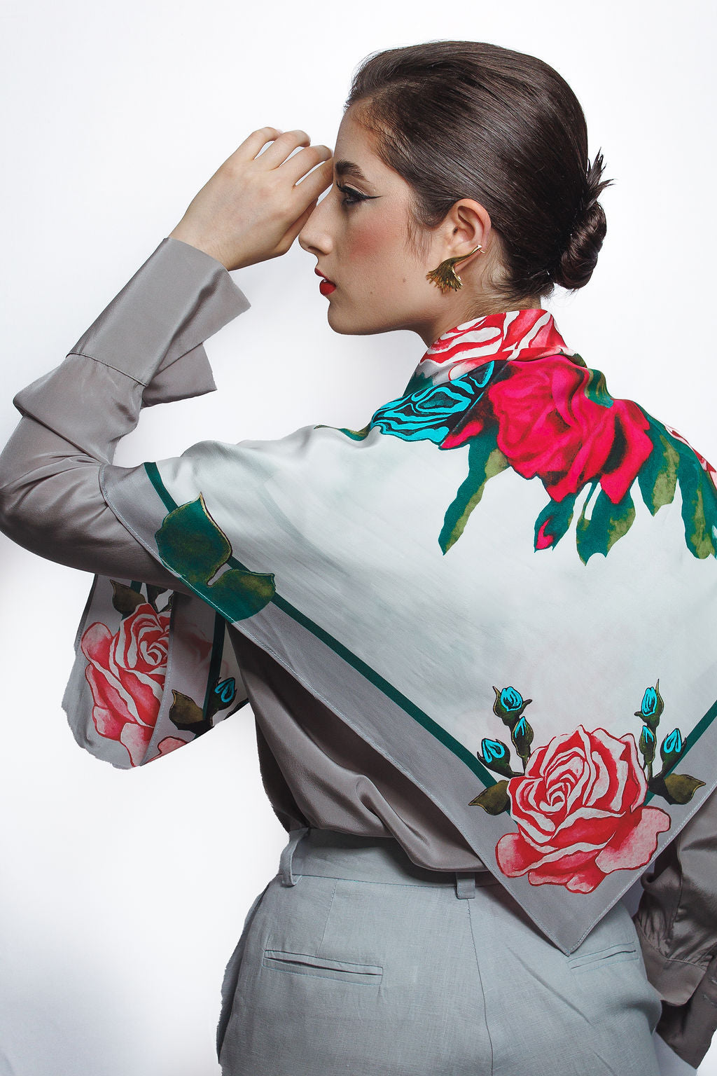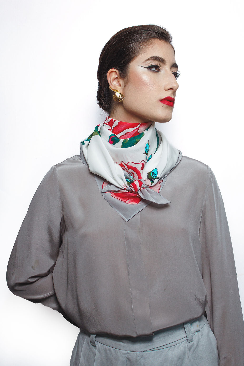 Lenços carré 90x90 feito em seda pura com estampa exclusiva da obra Quatro Estações pintada pelo artista sul-matogrossense Humberto Espíndola, considerado o mestre da arte da bovino cultura. O formato carré - quadrado possibilita diversos estilos de amarrações, seja na cintura, sob os ombros ou enrolado no pescoço, adornando peças básicas como camisetas, camisas, blazers e vestidos. Versão com fundo branco e rosas coloridas.