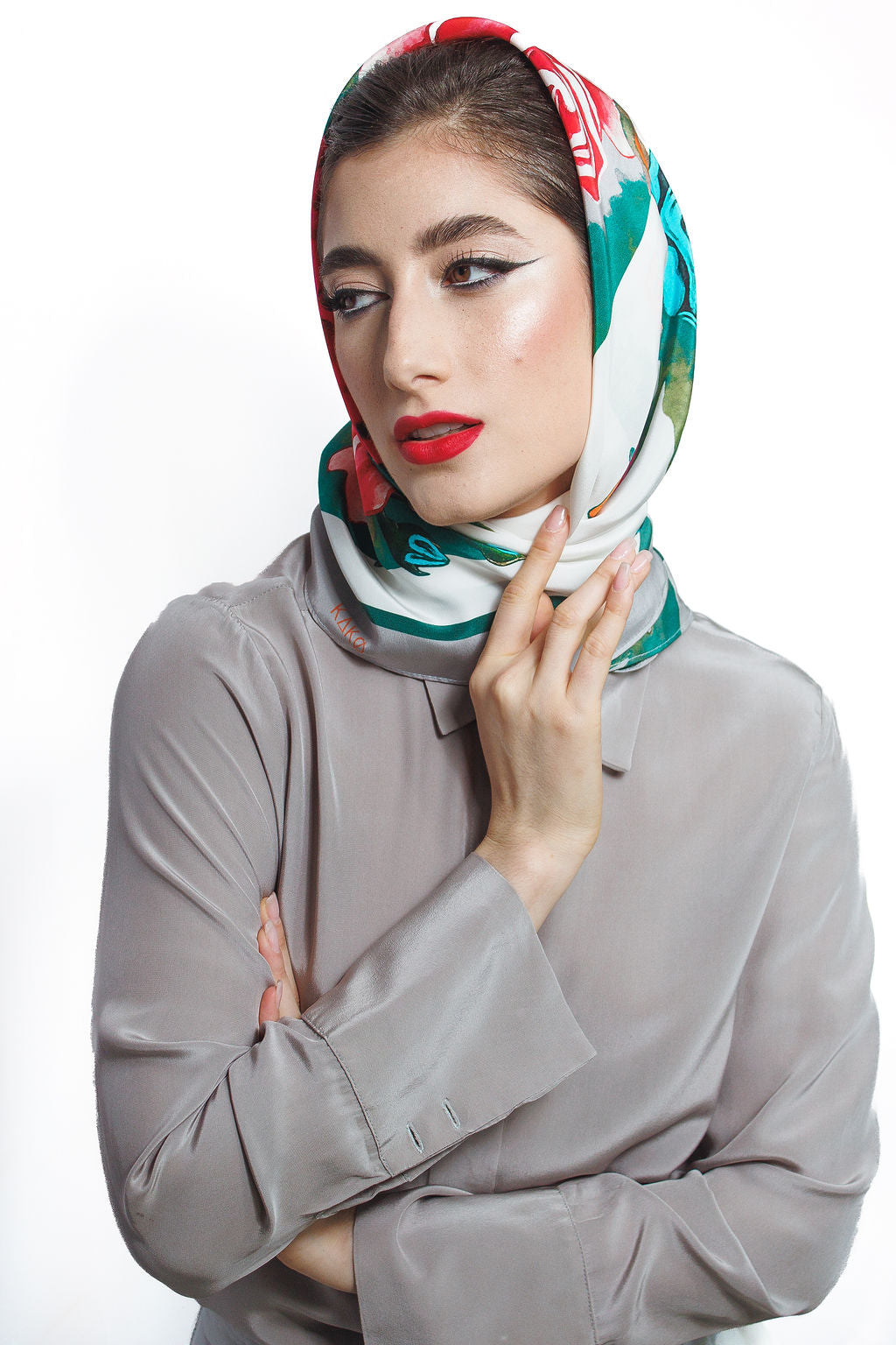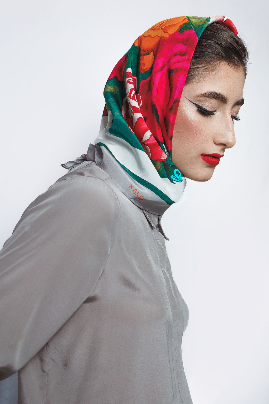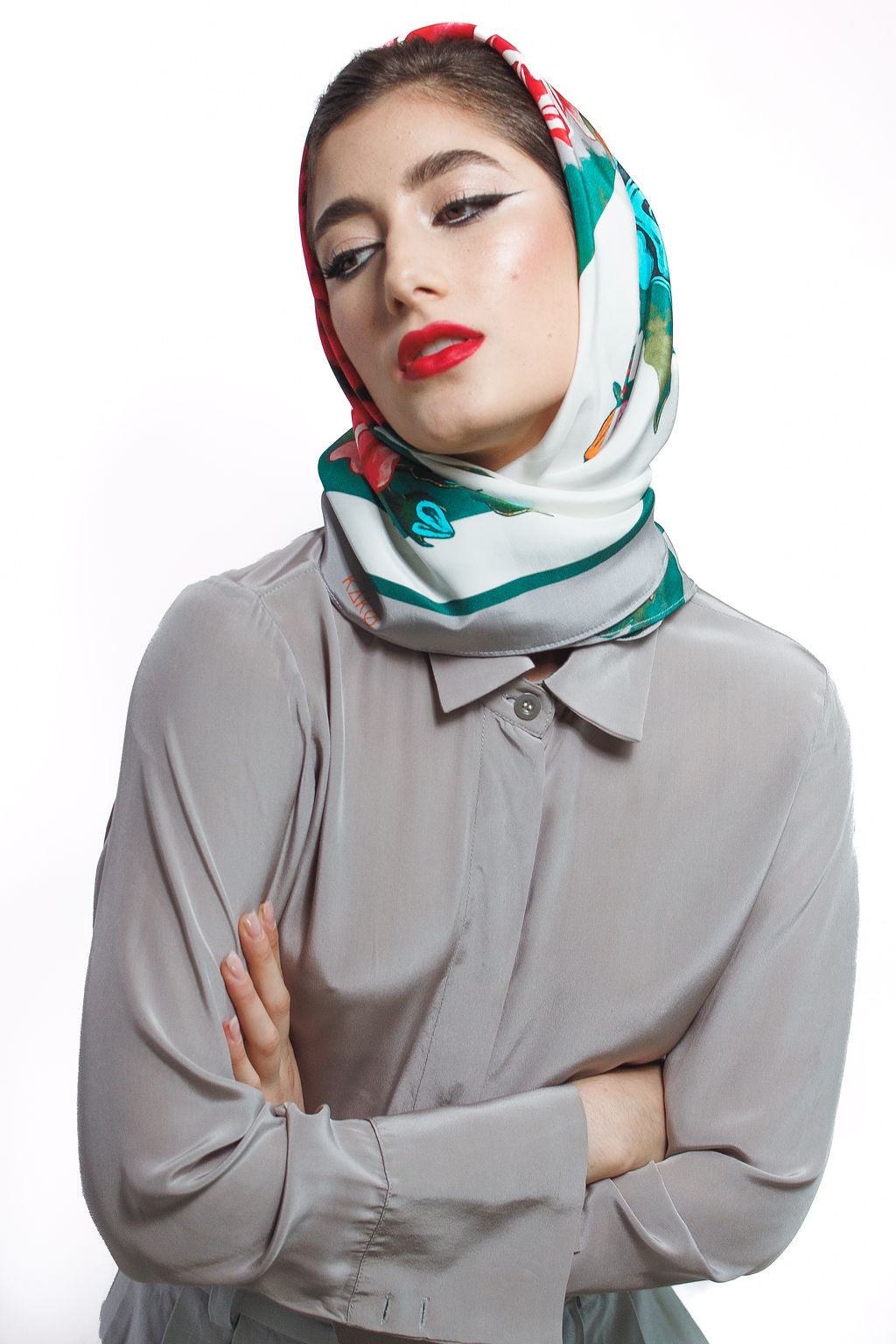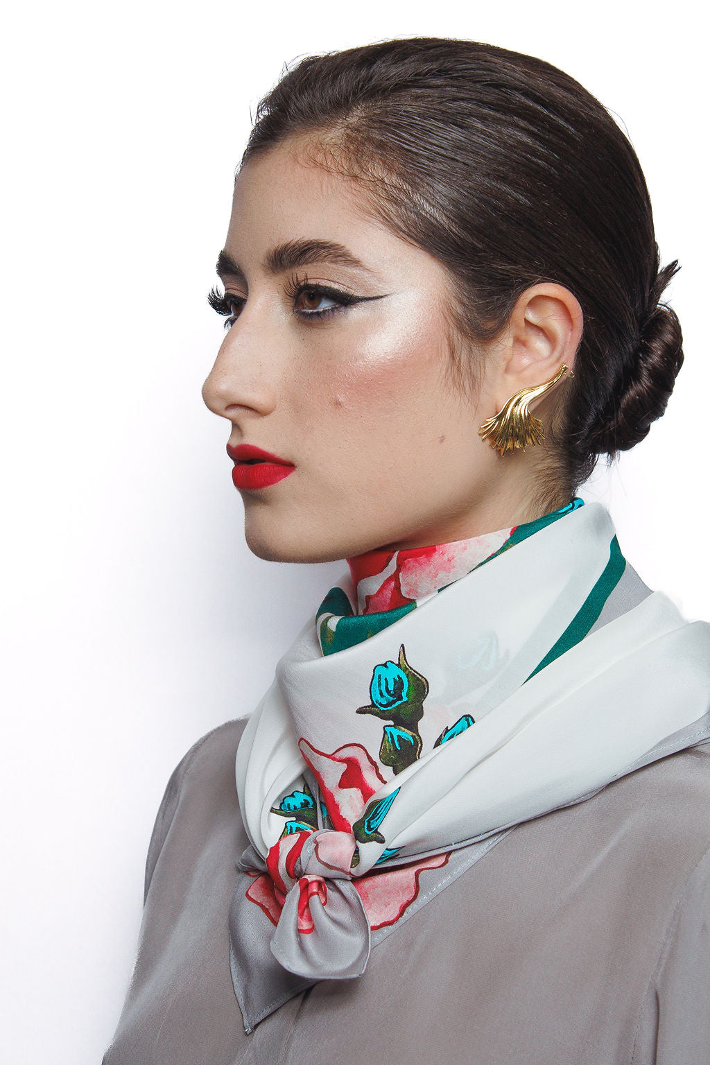 Lenços carré 90x90 feito em seda pura com estampa exclusiva da obra Quatro Estações pintada pelo artista sul-matogrossense Humberto Espíndola, considerado o mestre da arte da bovino cultura. O formato carré - quadrado possibilita diversos estilos de amarrações, seja na cintura, sob os ombros ou enrolado no pescoço, adornando peças básicas como camisetas, camisas, blazers e vestidos. Versão com fundo branco e rosas coloridas.