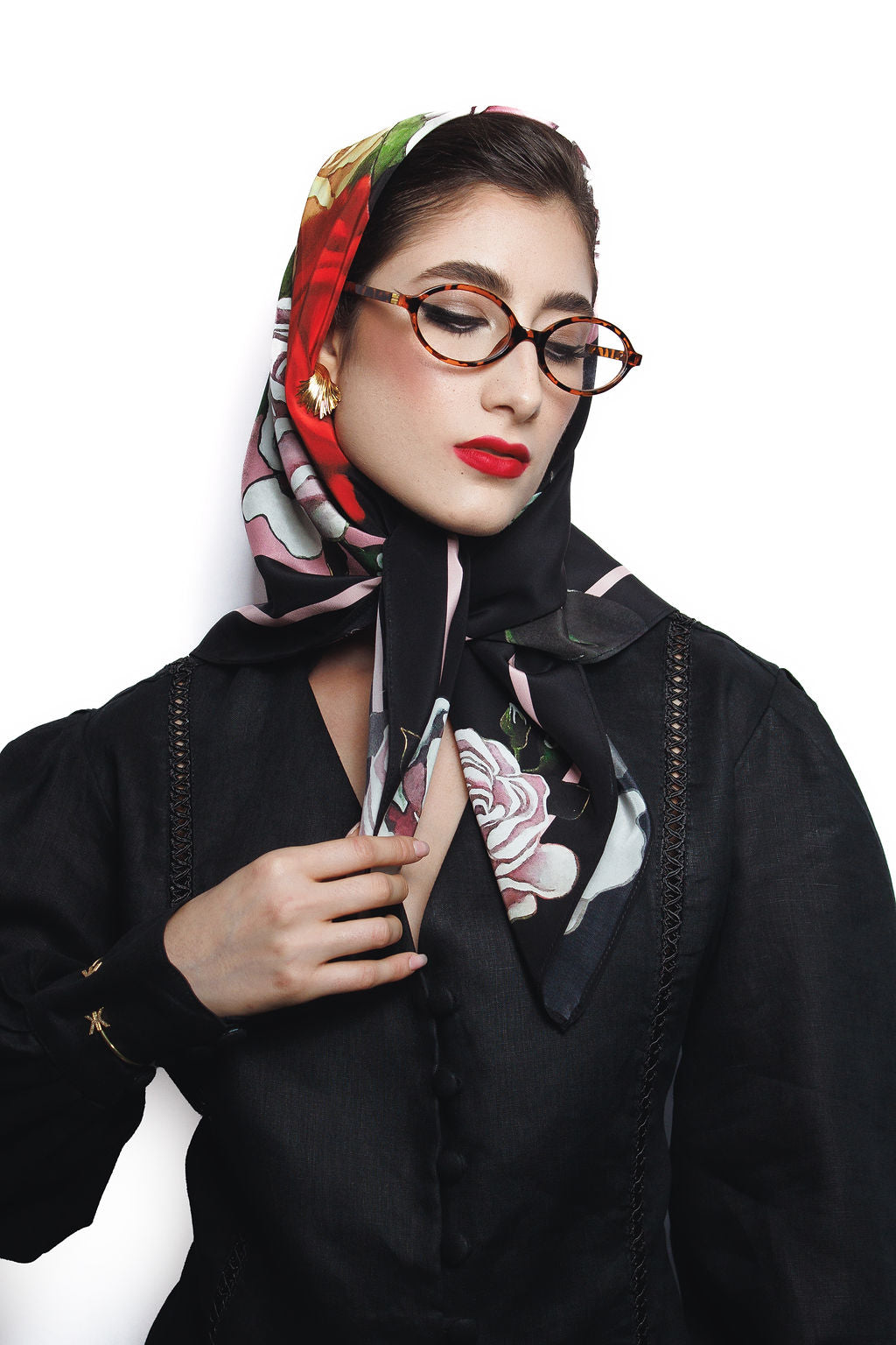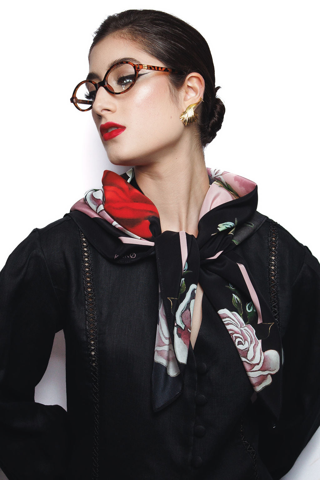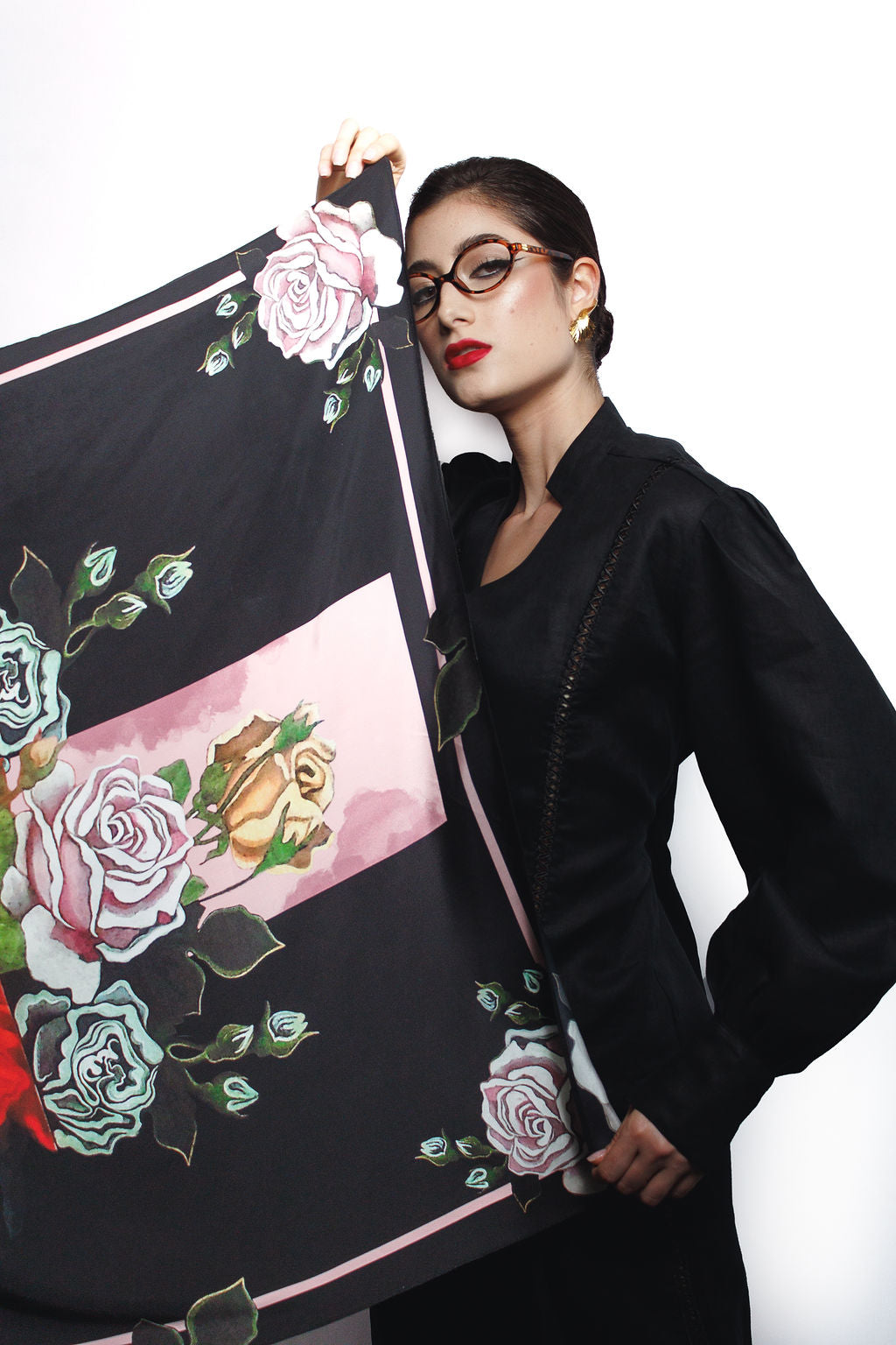 Lenços carré 90x90 feito em seda pura com estampa exclusiva da obra Quatro Estações pintada pelo artista sul-matogrossense Humberto Espíndola, considerado o mestre da arte da bovino cultura. O formato carré - quadrado possibilita diversos estilos de amarrações, seja na cintura, sob os ombros ou enrolado no pescoço, adornando peças básicas como camisetas, camisas, blazers e vestidos. Versão com fundo preto e rosas vermelhas.
