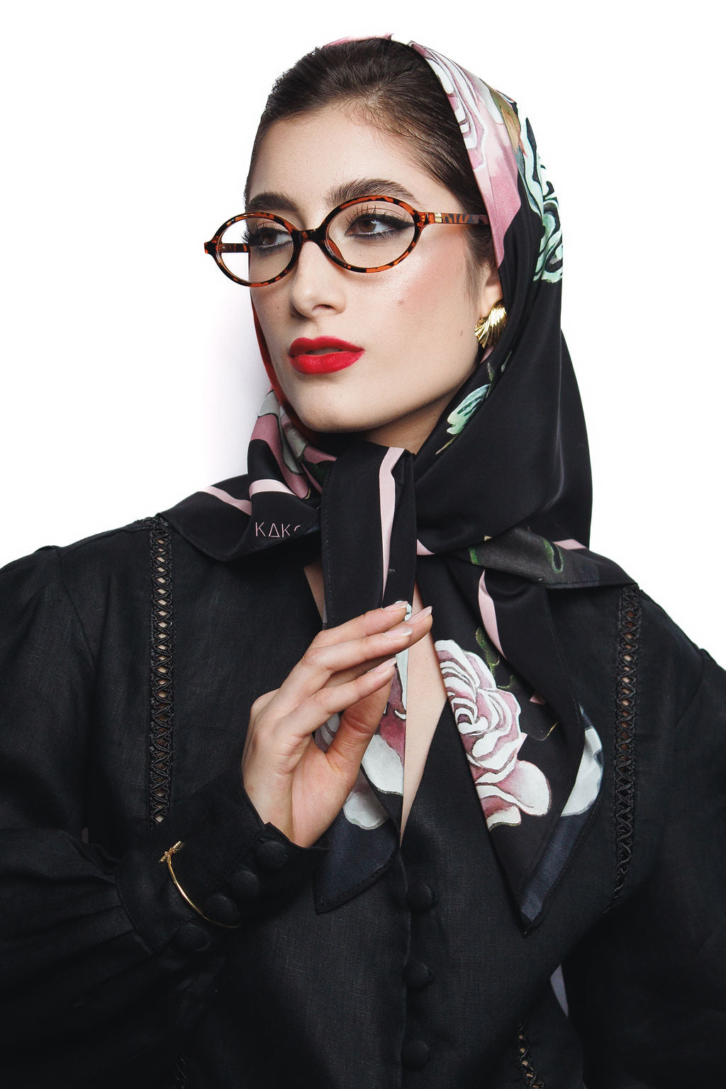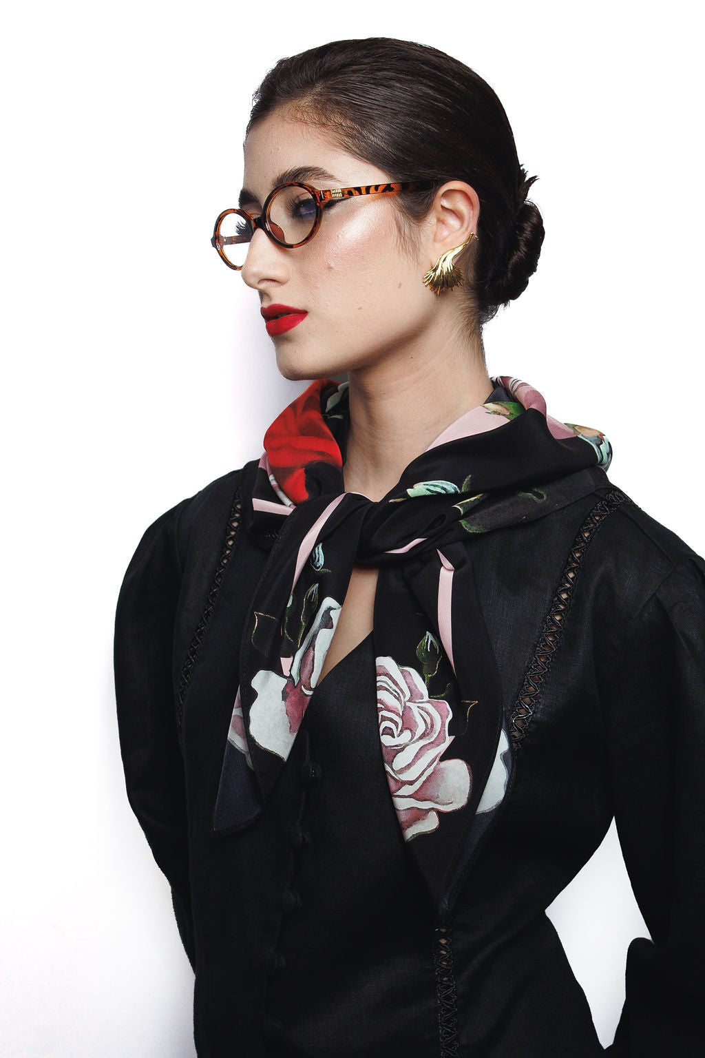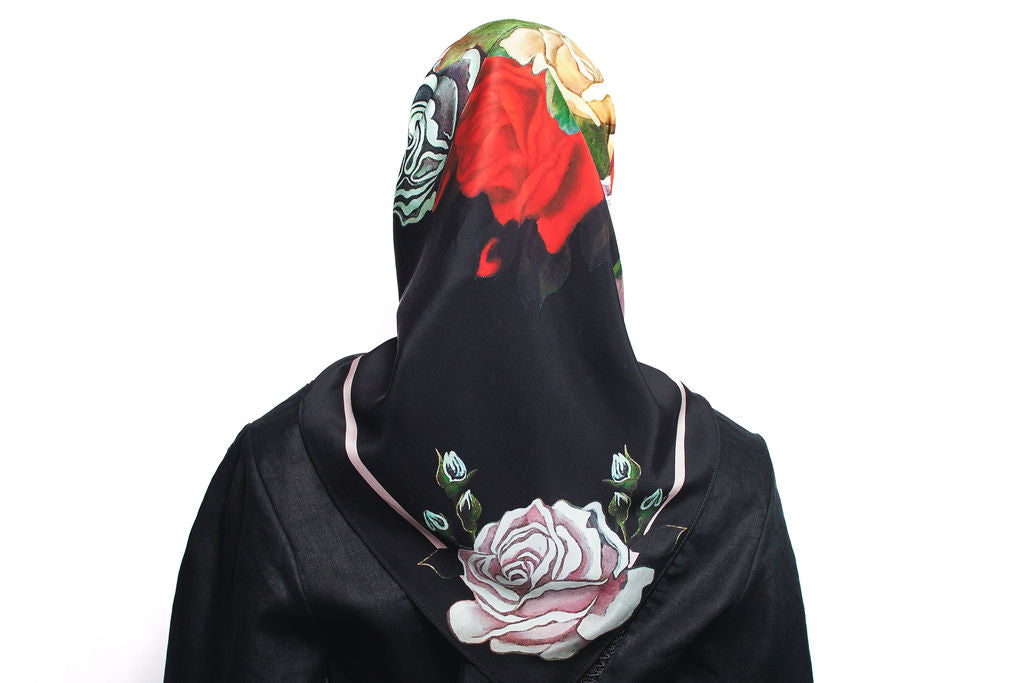 Lenços carré 90x90 feito em seda pura com estampa exclusiva da obra Quatro Estações pintada pelo artista sul-matogrossense Humberto Espíndola, considerado o mestre da arte da bovino cultura. O formato carré - quadrado possibilita diversos estilos de amarrações, seja na cintura, sob os ombros ou enrolado no pescoço, adornando peças básicas como camisetas, camisas, blazers e vestidos. Versão com fundo preto e rosas vermelhas.