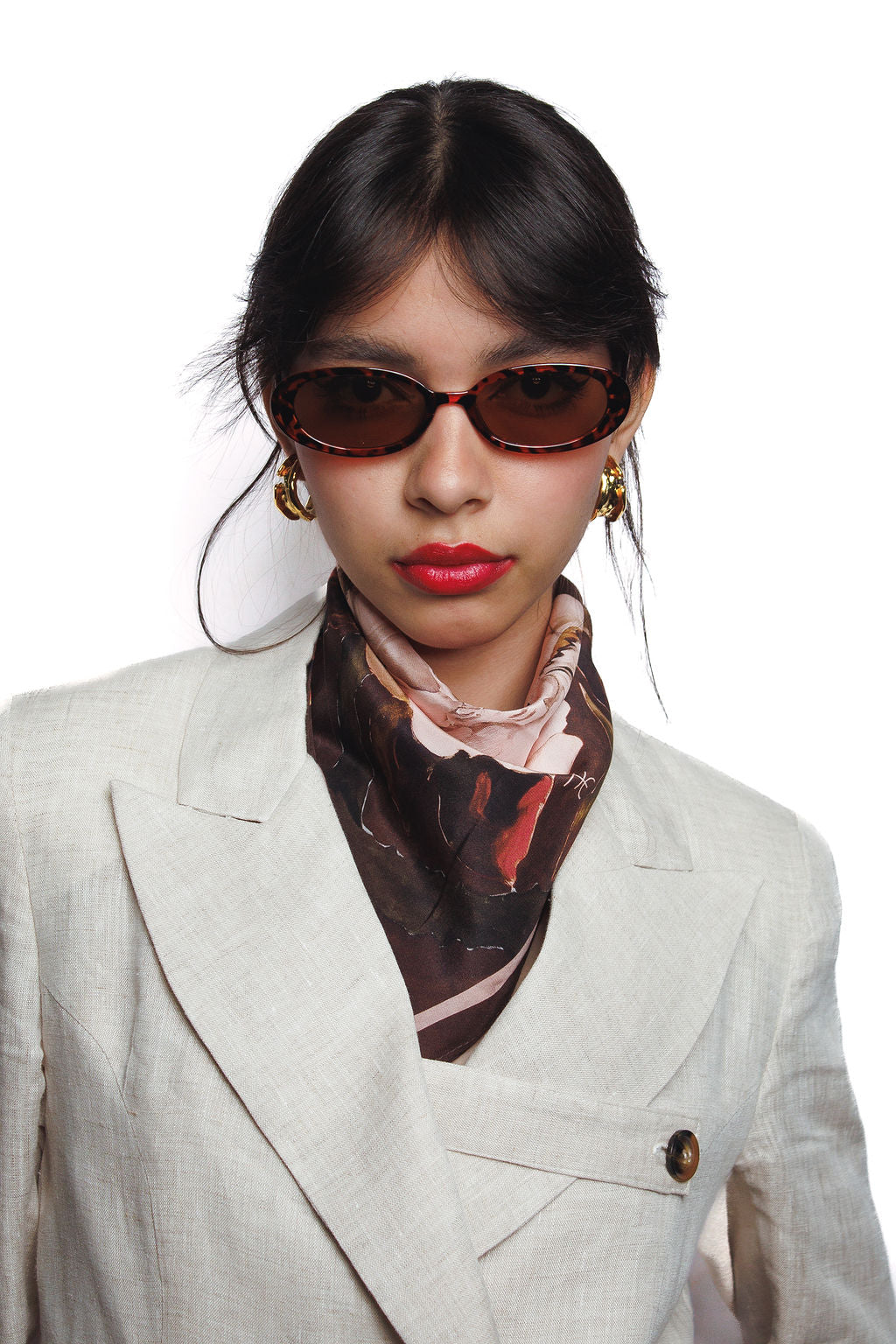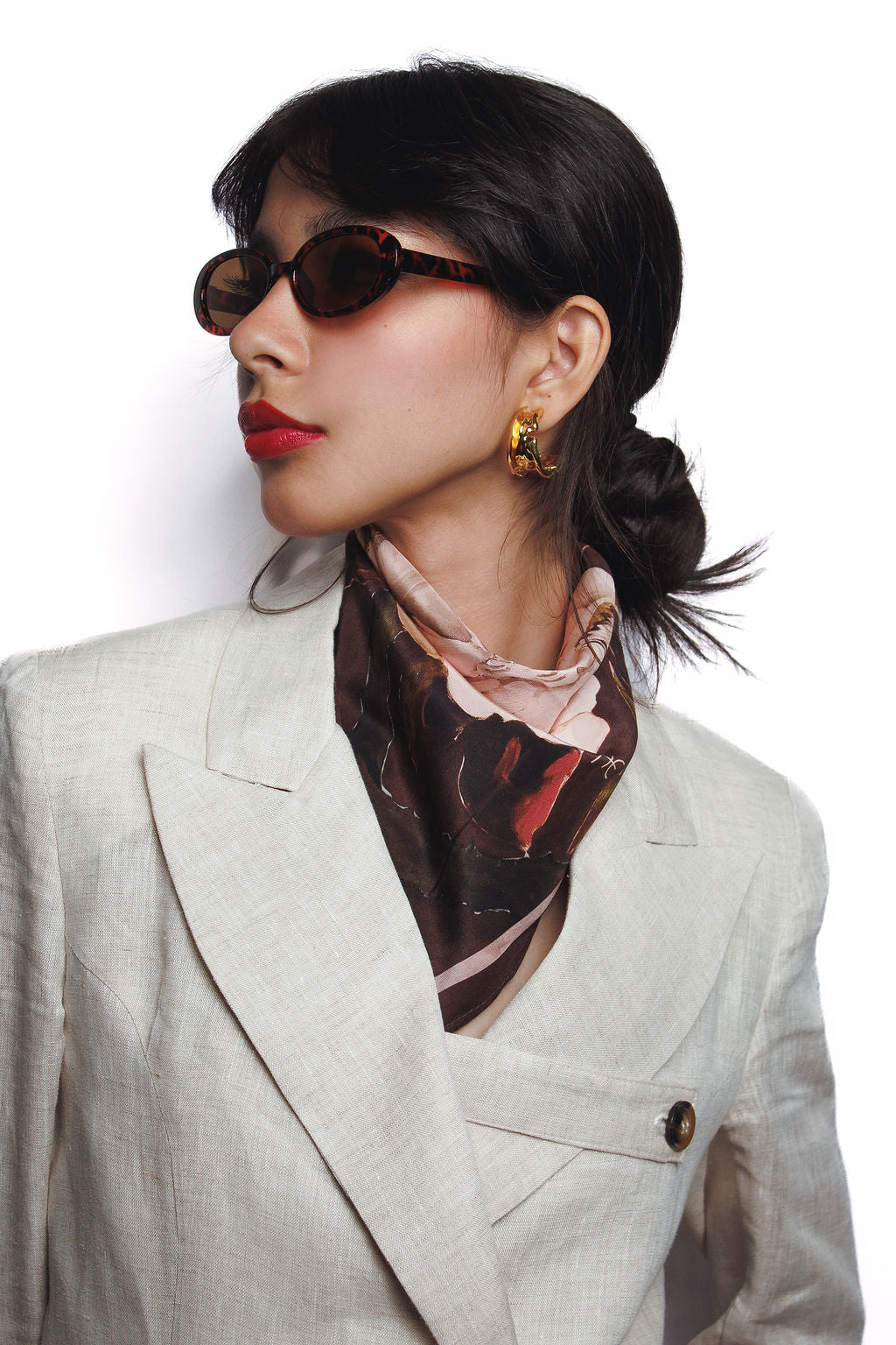 Lenços pequeno 45x45 feito em seda pura com estampa exclusiva da obra Rosa-boi pintada pelo artista sul-matogrossense Humberto Espíndola, considerado o mestre da arte da bovino cultura. O formato carré - quadrado possibilita diversos estilos de amarrações, seja na cintura, sob os ombros ou enrolado no pescoço, adornando peças básicas como camisetas, camisas, blazers e vestidos.