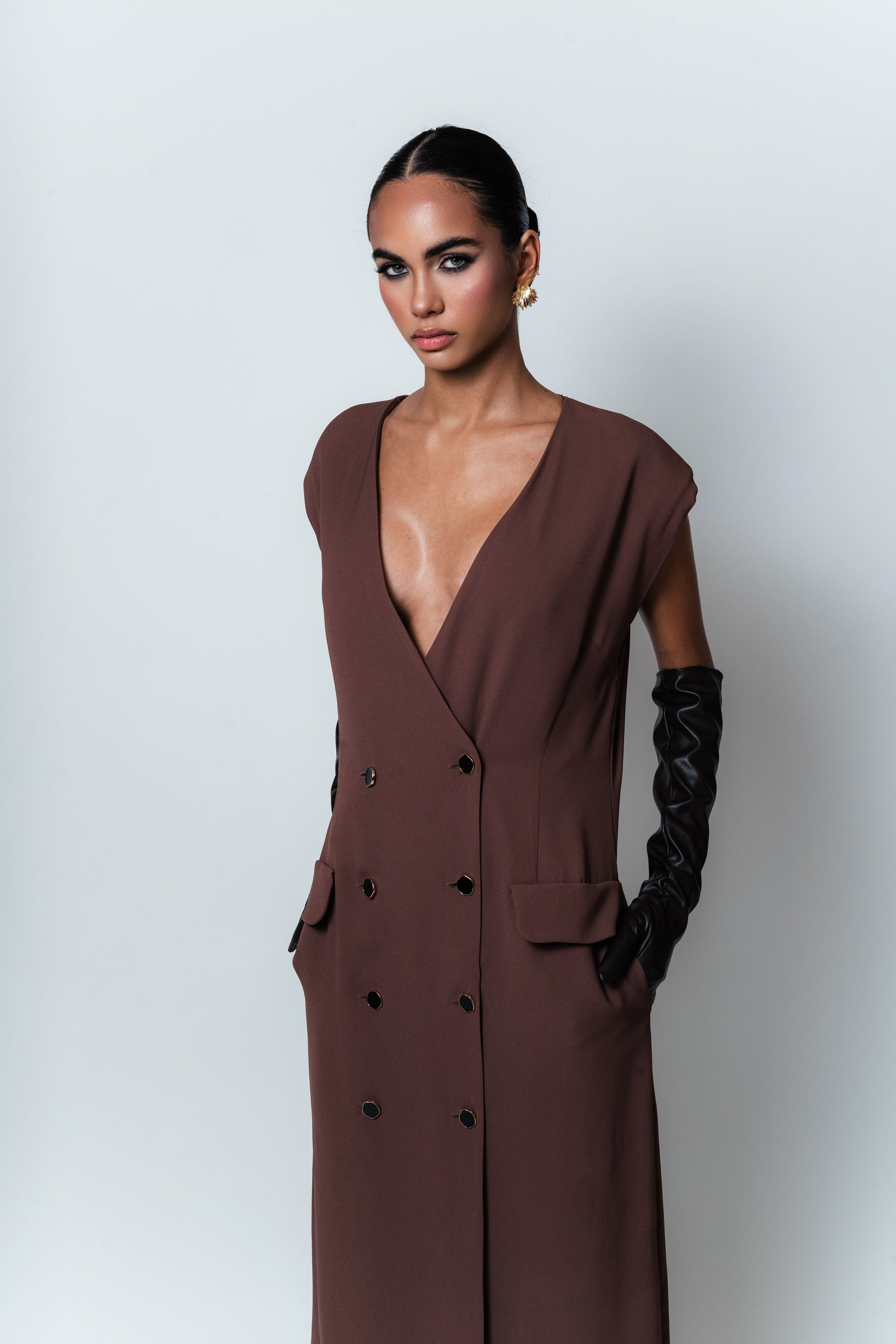 Umas das peças icônicas da Kakô, sofisticado, exclusivo e elegante, o maxi colete feito em crepe patou, decote V transpassado com fechamento de botões esmaltados, bolso alfaiataria na frente com lapela e bolso na costura lateral, costas com decote v mais profundo com aplicação de corrente dourada. Use aberto como capa sobreposta nos tops, calças e tops disponíveis na coleção.