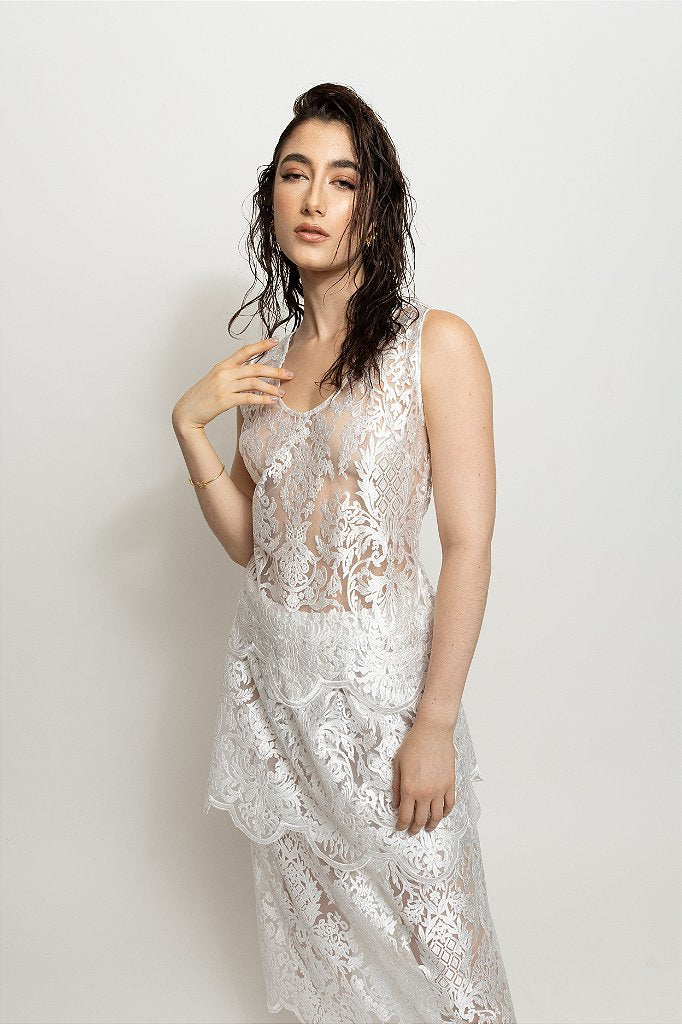 Na foto a modelo veste tamanho 38 (P). Lembrando que as peças amplas e tem uma margem de vestibilidade.