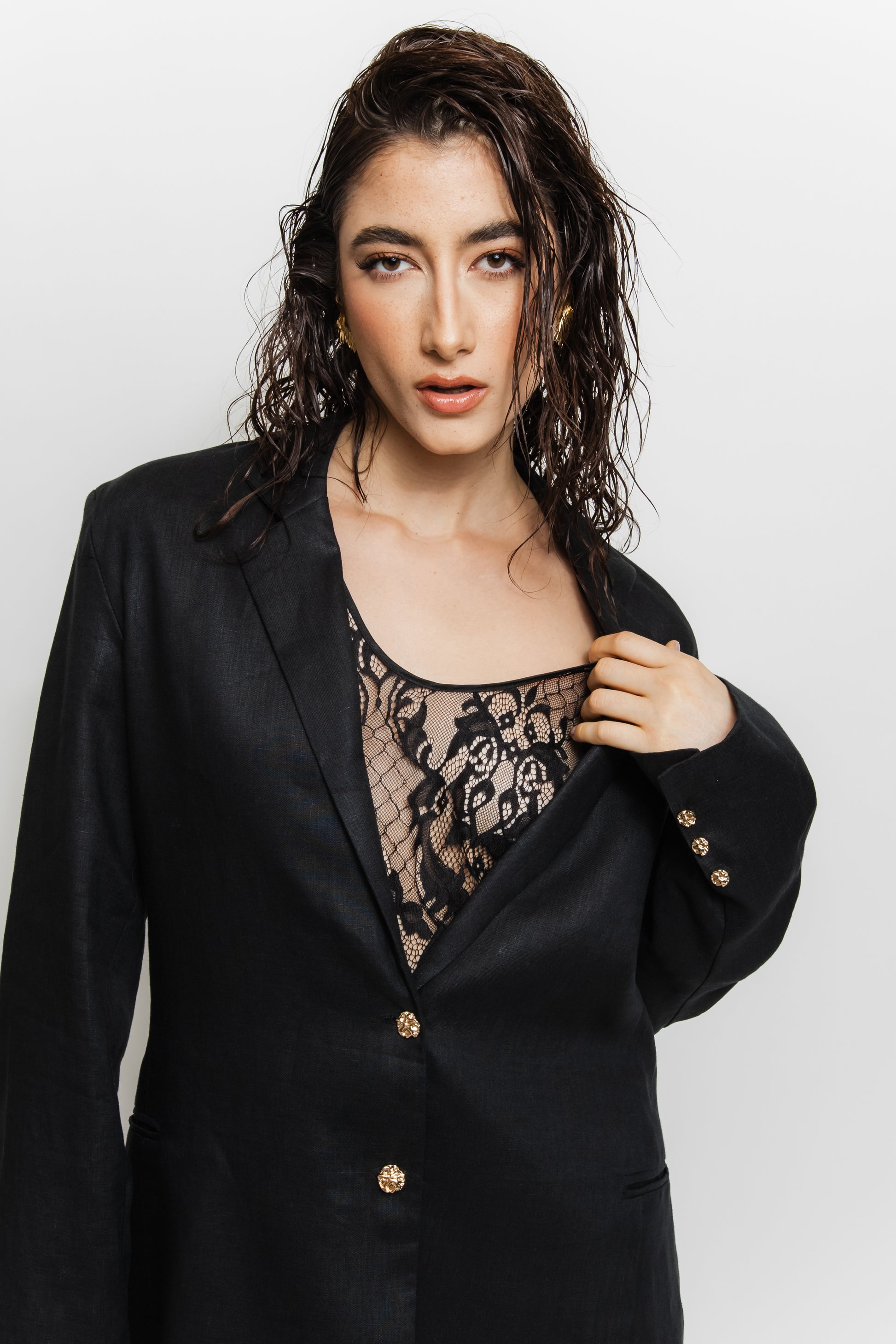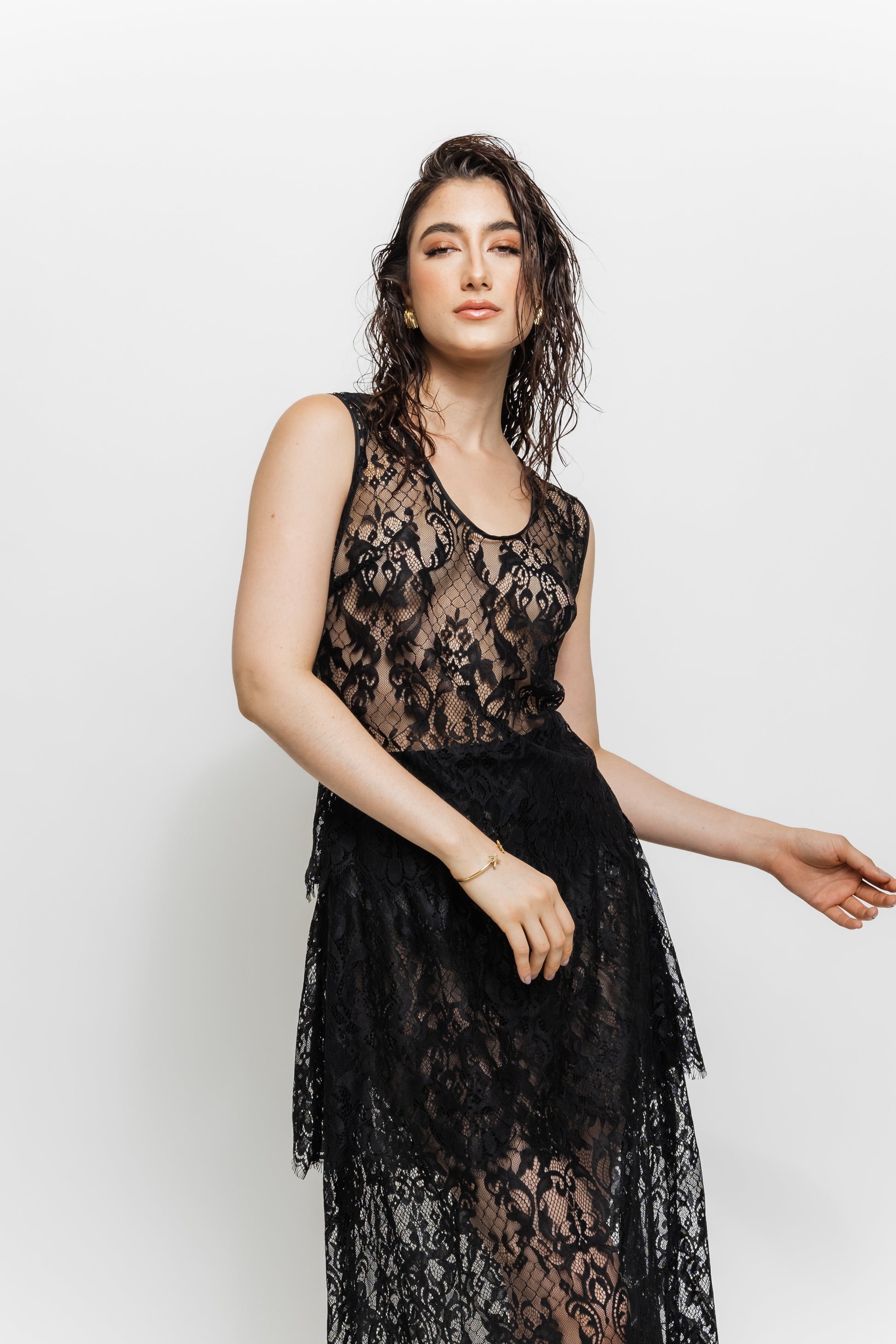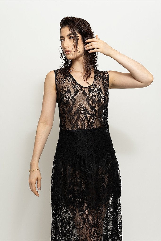 Confeccionada em renda chantilly de toque leve e textura rica, valoriza o corpo com elegância e feminilidade. A modelagem reta proporciona um caimento fluido, enquanto os detalhes rendados trazem charme e romantismo à produção.
