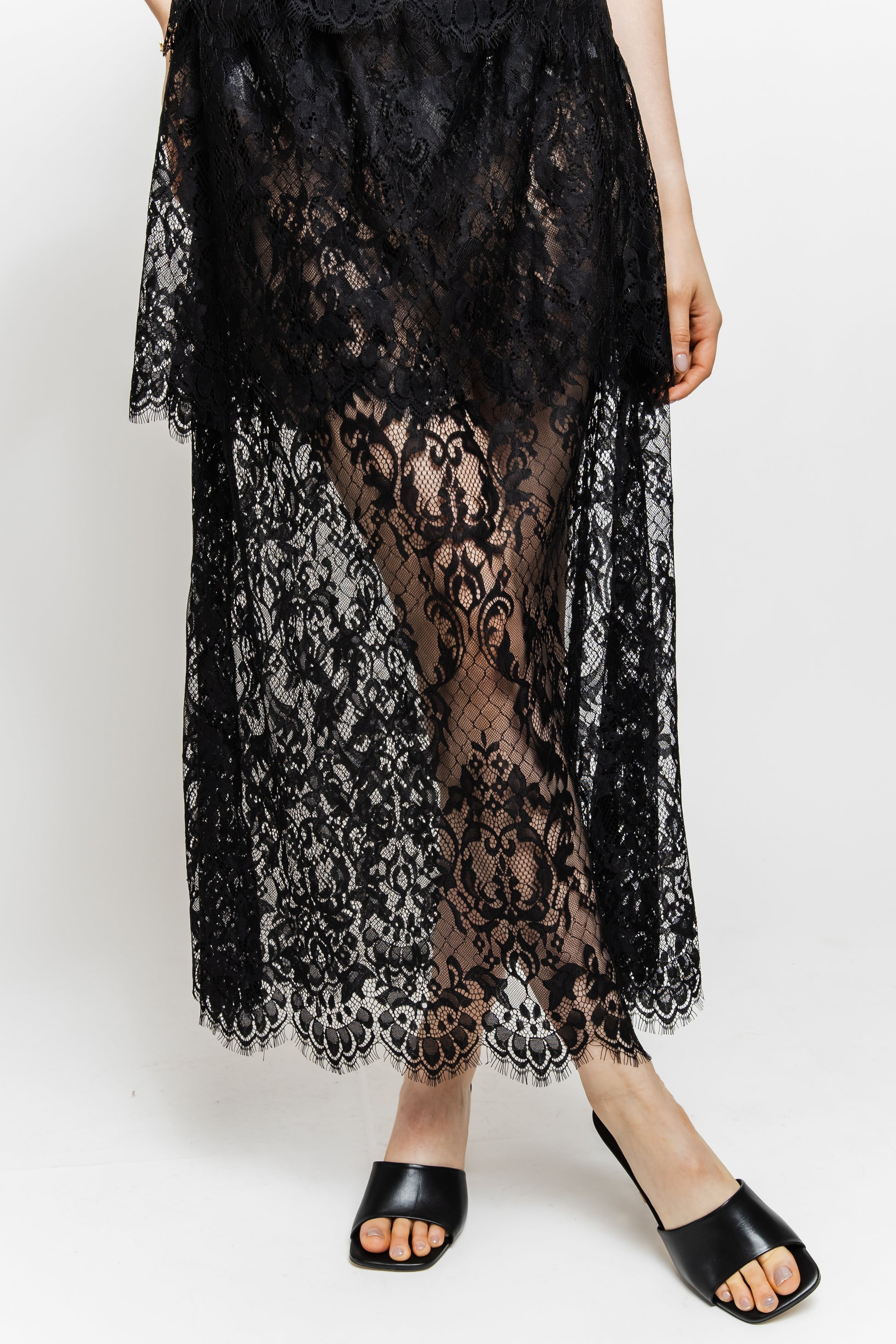 Clássica e extremamente feminina, feita com uma sofisticado renda chantily, o detalhe da sobreposição do peplum que vem da cintura até altura do quadril traz glamour e delicadeza deixando a transparência mais sutil, o comprimento midi com barrado arredondado da própria renda deixa a peça ainda exclusiva e especial. Use com t-shirt de algodão ou blazer alongado de linho ou crepe para looks contemporâneos.
