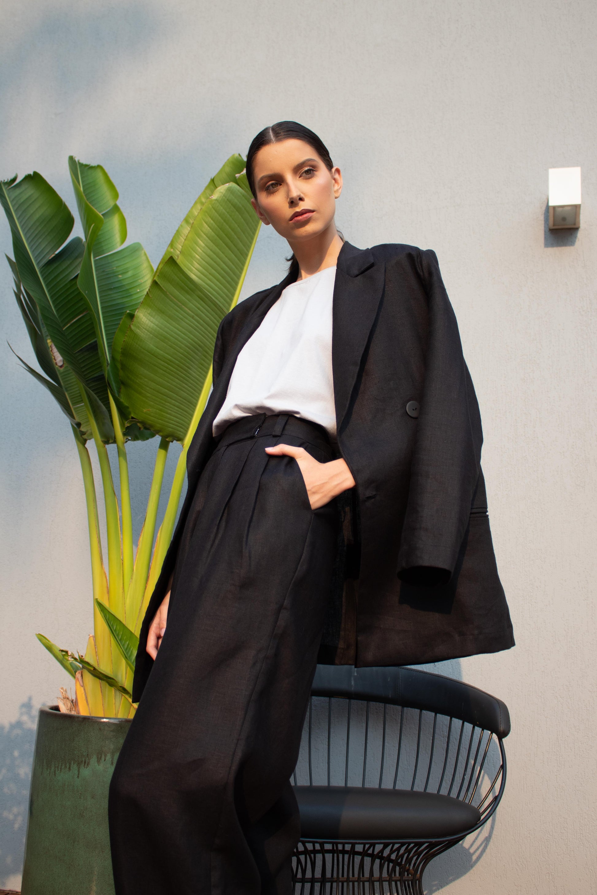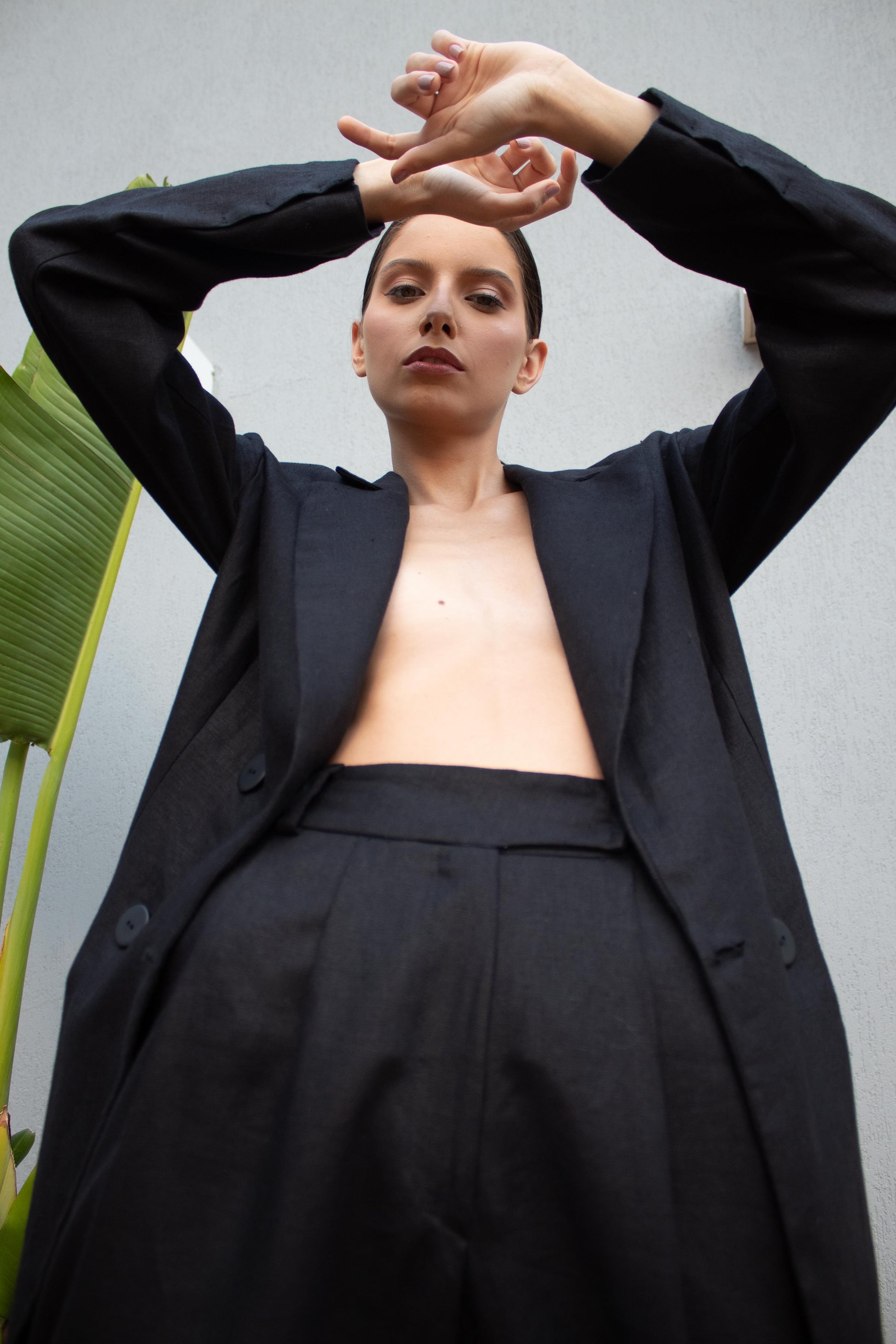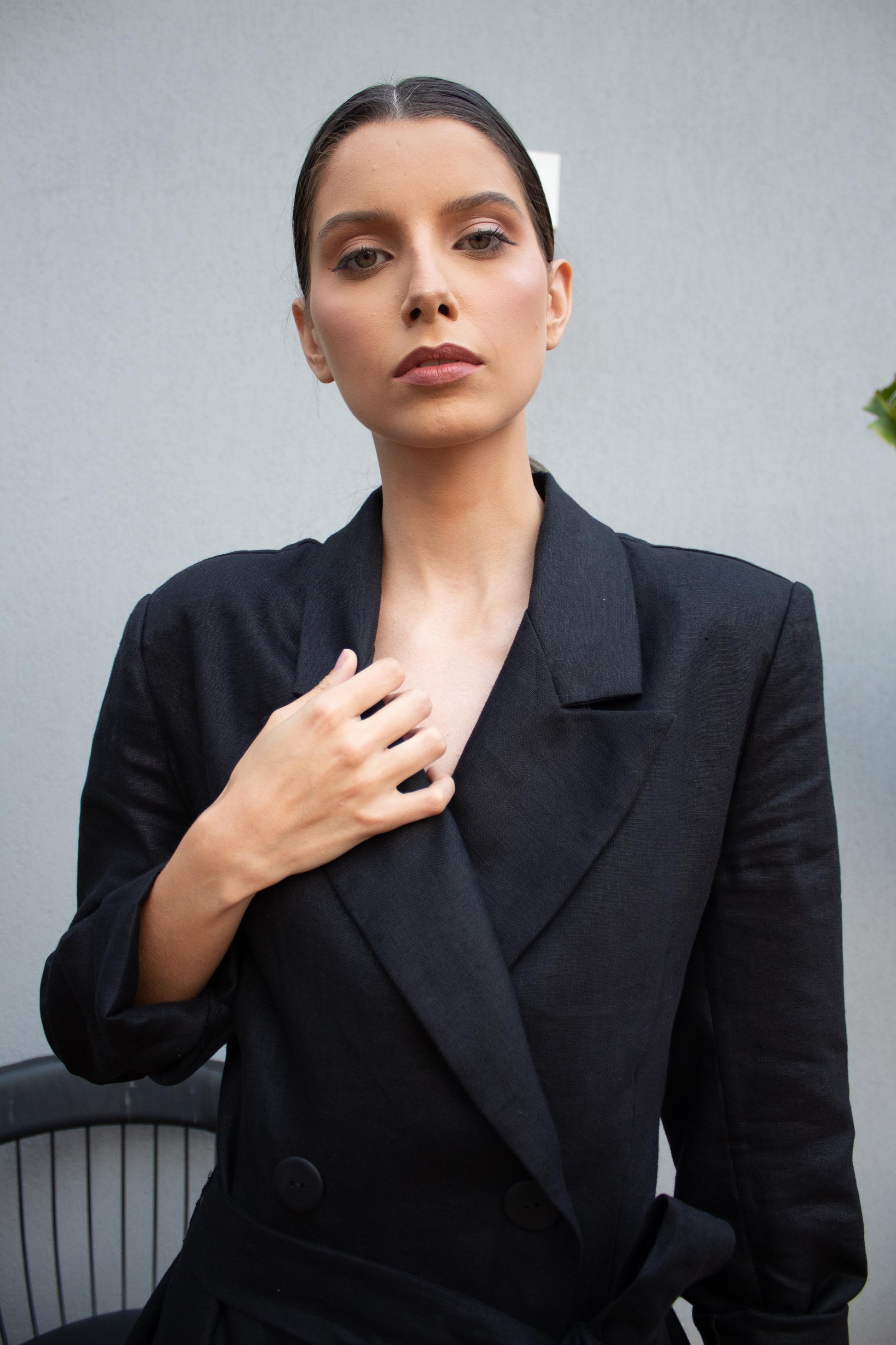 A alfaiataria contemporânea realça o perfil escultural do blazer tuxedo feito em linho puro, shape amplo e alongado com design clássico, transpasse com quatro botões, ombreira, pode ser usado sozinho como vestido, ou de maneira tradicional sob calça, short ou saia - observe a faixa trabalhada como cinto, fechamento regulável, e os bolsos de alfaiataria nas laterais. Elegante e atemporal, tem nas cores natural, marrom, branco e preto. Aqui usado com vestido transpassado.